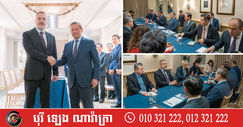 (សហរដ្ឋអាមេរិក)៖ សម្តេចបវរធិបតី ហ៊ុន ម៉ាណែត នាយករដ្ឋមន្ត្រីនៃកម្ពុជា នៅព្រឹកថ្ងៃសុក្រ ទី២០ ខែកុម្ភៈ ឆ្នាំ២០២៦ (ម៉ោងនៅអាមេរិក) បានជួបពិភាក្សាការងារជាលោក Hakan Fidan រដ្ឋមន្ត្រីការបរទេសតួកគី ក្នុងឱកាសនៃការអញ្ជើញដឹកនាំគណៈប្រតិភូជាន់ខ្ពស់រាជរដ្ឋាភិបាលកម្ពុជា ចូលរួមកិច្ចប្រជុំលើកដំបូងនៃក្រុមប្រឹក្សាសន្តិភាព (Board of Peace) នៅរដ្ឋធានីវ៉ាស៊ីនតោន សហរដ្ឋអាម៉េរិក៕
