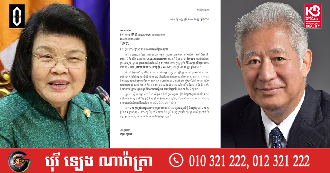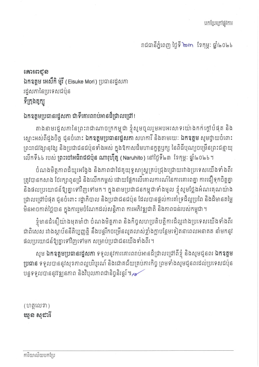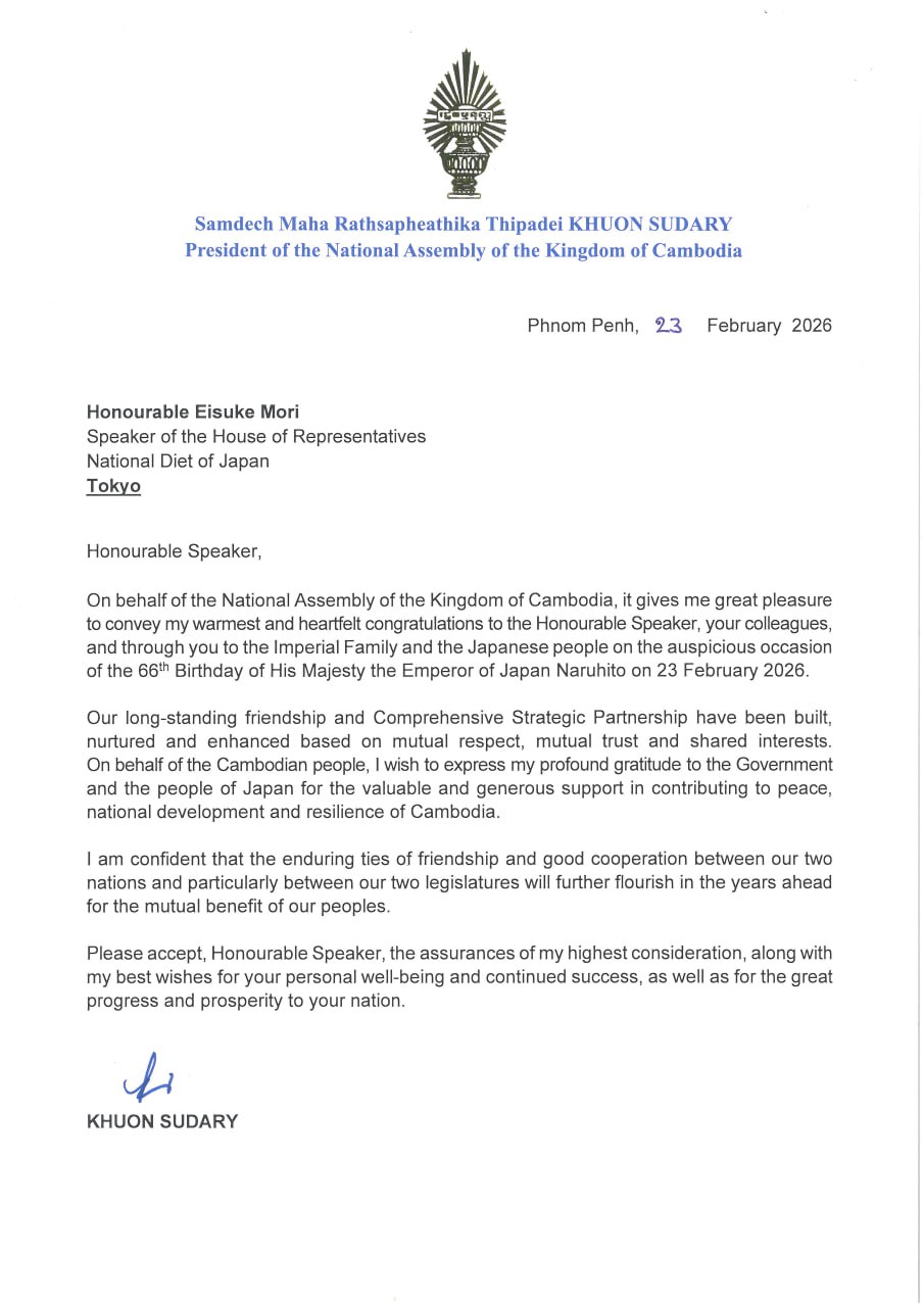 (ភ្នំពេញ)៖ សម្តេចមហារដ្ឋសភាធិការធិបតី ឃួន សុដារី ប្រធានរដ្ឋសភា នៃព្រះរាជាណាចក្រកម្ពុជា បានផ្ញើសារគោរពជូន លោក អេសកិ ម៉ូរី (Eisuke Mori) ប្រធានរដ្ឋសភា នៃប្រទេសជប៉ុន ក្នុងឱកាសដ៏មហានក្ខត្តឫក្ស នៃពិធីបុណ្យចម្រើនព្រះជន្មាយុ លើកទី៦៦ របស់ ព្រះចៅអធិរាជជប៉ុន ណារុហ៊ីតូ (Naruhito) នៅថ្ងៃទី២៣ ខែកុម្ភៈ ឆ្នាំ២០២៦។