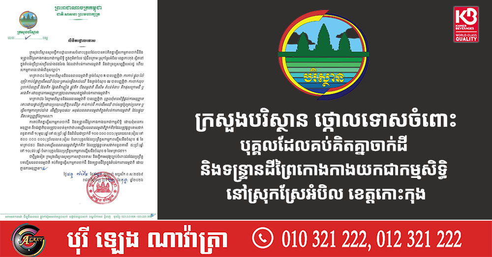 ក្រសួងបរិស្ថាន សូមប្រកាសថ្កោលទោស និងធ្វើការអនុវត្តច្បាប់ចំពោះជនដែលប្រព្រឹត្ត បទល្មើសធនធានធម្មជាតិ គប់គិតគ្នាធ្វើសកម្មភាពចាក់ដី និងទន្ទ្រានដីព្រៃក្នុងតំបន់ការពារធម្មជាតិ ដោយគ្មានការអនុញ្ញាត៕