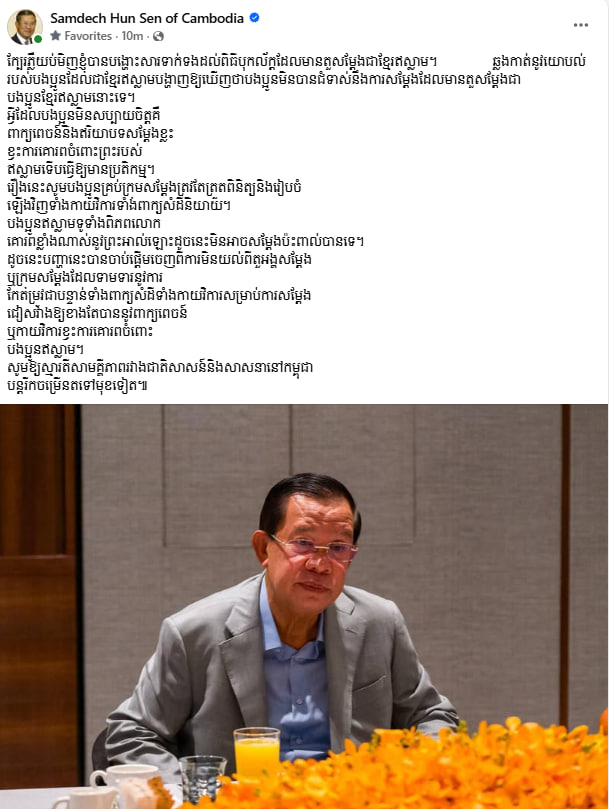 (ភ្នំពេញ)៖ បន្ទាប់ពីបង្ហោះសារនៅទៀបភ្លឺថ្ងៃទី២៤ ខែកុម្ភៈ ឆ្នាំ២០២៦នេះ ពាក់ព័ន្ធប្រពៃណីបុកល័ក្ត ក្នុងពិធីអាពាហ៍ពិពាហ៍ខ្មែរ ព្រោះមិនចង់ឃើញទំនាស់រវាងខ្មែរ និងខ្មែរ-ឥស្លាមកាន់តែរីកធំនោះ នៅព្រឹកនេះសម្តេចតេជោ ហ៊ុន សែន ប្រធានព្រឹទ្ធសភាកម្ពុជា បានចេញសារបន្ថែមថ្មីមួយទៀត ជុំវិញការសំដែងជាតួខ្មែរឥស្លាម ក្នុងពិធីបុកល័ក្តនេះ។