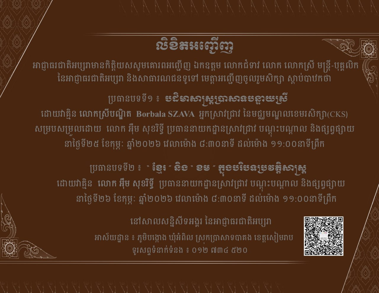 ដូច្នេះ ដើម្បីស្វែងយល់ពីអត្ថន័យនិងសារសំខាន់នៃប្រធានបទទាំង២ ឱ្យកាន់តែច្បាស់ សូមសាធារណជន មន្ត្រីរាជការ បុគ្គលិកគ្រប់ក្រសួង ស្ថាប័ន មគ្គុទ្ទេសក៍ទេសចរណ៍ សិស្ស និស្សិត និងអ្នកសិក្សាស្រាវជ្រាវគ្រប់មជ្ឈដ្ឋាន មេត្តាអញ្ជើញចូលរួមស្តាប់ដោយសេរី នៅសាលសនិ្នសីទអង្គរ នៃអាជ្ញាធរជាតិអប្សរា ដែលមានអាសយដ្ឋាន៖ ភូមិបង្កោង ឃុំអំពិល ស្រុកប្រាសាទបាគង ខេត្តសៀមរាប ទូរស័ព្ទទំនាក់ទំនងលេខ ០១២ ៧៣៤ ៥២០៕