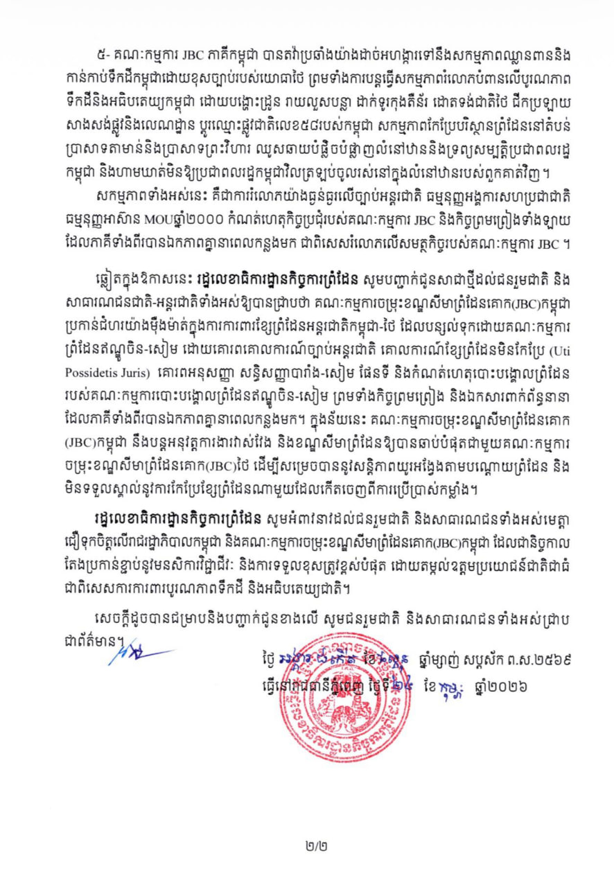 ឆ្លៀតក្នុងឱកាសនេះ រដ្ឋលេខាធិការដ្ឋានកិច្ចការព្រំដែន បានបញ្ជាក់ជូនសាជាថ្មីថា គណៈកម្មការចម្រុះខណ្ឌសីមាព្រំដែនគោក(JBC)កម្ពុជា ប្រកាន់ជំហរយ៉ាងម៉ឺងម៉ាត់ក្នុងការការពារខ្សែព្រំដែនអន្តរជាតិកម្ពុជា-ថៃ ដែលបន្សល់ទុកដោយគណៈកម្មការព្រំដែនឥណ្ឌូចិន-សៀម ដោយគោរពគោលការណ៍ច្បាប់អន្តរជាតិ គោលការណ៍ខ្សែព្រំដែនមិនកែប្រែ (Uti Possidetis Juris) គោរពអនុសញ្ញា សន្ធិសញ្ញាបារាំង-សៀម ផែនទី និងកំណត់ហេតុបោះបង្គោលព្រំដែន របស់គណៈកម្មការបោះបង្គោលព្រំដែនឥណ្ឌូចិន-សៀម ព្រមទាំងកិច្ចព្រមព្រៀង និងឯកសារពាក់ព័ន្ធនានា ដែលភាគីទាំងពីរបានឯកភាពគ្នានាពេលកន្លងមក។ ក្នុងន័យនេះ គណៈកម្មការចម្រុះខណ្ឌសីមាព្រំដែនគោក (JBC)កម្ពុជា នឹងបន្តអនុវត្តការងារវាស់វែង និងខណ្ឌសីមាព្រំដែនឱ្យបានឆាប់បំផុតជាមួយគណៈកម្មការ ចម្រុះខណ្ឌសីមាព្រំដែនគោក(JBC)ថៃ ដើម្បីសម្រេចបាននូវសន្តិភាពយូរអង្វែងតាមបណ្តោយព្រំដែន និង មិនទទួលស្គាល់នូវការកែប្រែខ្សែព្រំដែនណាមួយដែលកើតចេញពីការប្រើប្រាស់កម្លាំង។