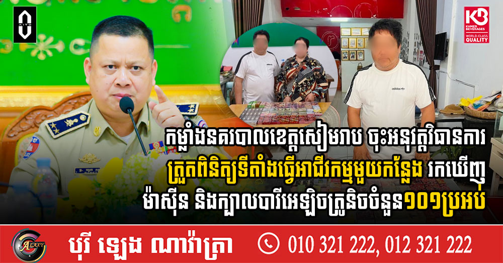 កម្លាំងនគរបាលខេត្តសៀមរាប ចុះអនុវត្តវិធានការត្រួតពិនិត្យទីតាំងធ្វើអាជីវកម្មមួយកន្លែង រកឃើញម៉ាស៊ីន និងក្បាលបារីអេឡិចត្រូនិចចំនួន១០១ប្រអប់