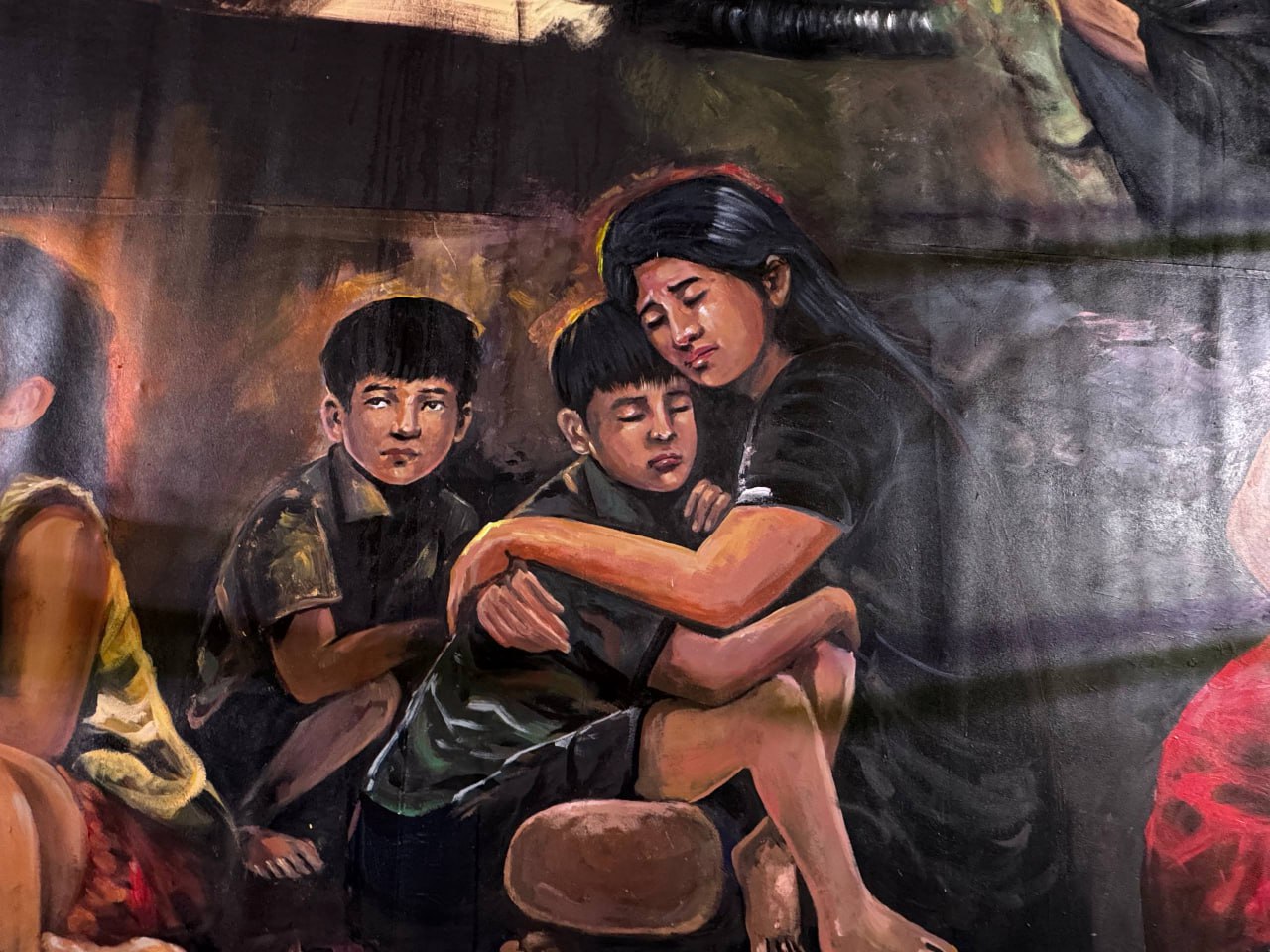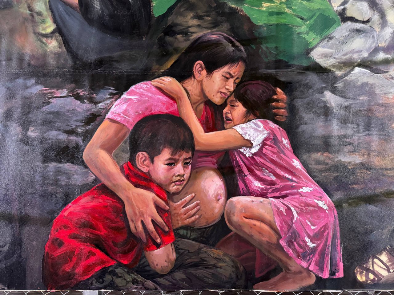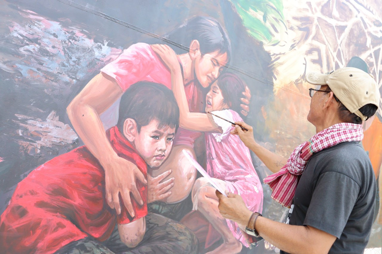 ជាវិចិត្រករមួយរូបរស់នៅរាធានីភ្នំពេញ លោក អ៊ុំ លាង បានមកគូរដោយស្ម័គ្រចិត្តនៅទីនេះ រយៈពេល ៤ថ្ងៃមកហើយ។ រូបស្រ្តីមានផ្ទៃពោះ កំពុងអោបកូនតូចប្រុសស្រី ២នាក់ ក្នុងទឹកមុខភ័យរន្ធត់ គឺជារូបគំនូរដែលលោកកំពុងគូរដោយអារម្មណ៍សោគសង្រេង ដោយនឹករលឹកពីភាពភ័យខ្លាចដែលស្រ្តី និងកុមារបានជួបប្រទះ។
