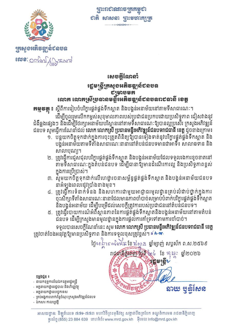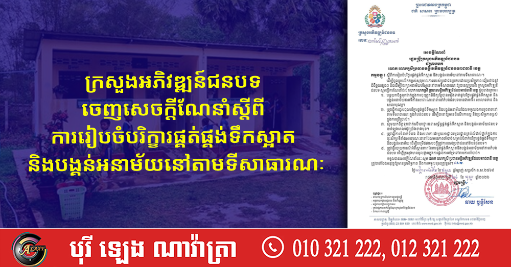 (ភ្នំពេញ)៖ ក្រសួងអភិវឌ្ឍន៍ជនបទ នៅថ្ងៃទី២៤ ខែកុម្ភៈ ឆ្នាំ២០២៦ បានចេញសេចក្ដីណែនាំស្តីពី ការរៀបចំបរិក្ខារផ្គត់ផ្គង់ទឹកស្អាត និងបង្គន់អនាម័យនៅតាមទីសាធារណៈ ដើម្បីចូលរួមលើកកម្ពស់សុខុមាលភាពរបស់ប្រជាជនប្រកបដោយប្រសិទ្ធភាព ជៀសវាងនូវ និងដើម្បីថែរក្សាអនាម័យបរិស្ថាន នៅតាមទីសាធារណៈឱ្យបានល្អប្រសើរ។ នេះបើយោងតាមសេចក្ដីណែនាំរបស់ ក្រសួងអភិវឌ្ឍន៍ជនបទ ដែលអង្គភាពព័ត៌មាន Fresh News ទទួលបាន៕