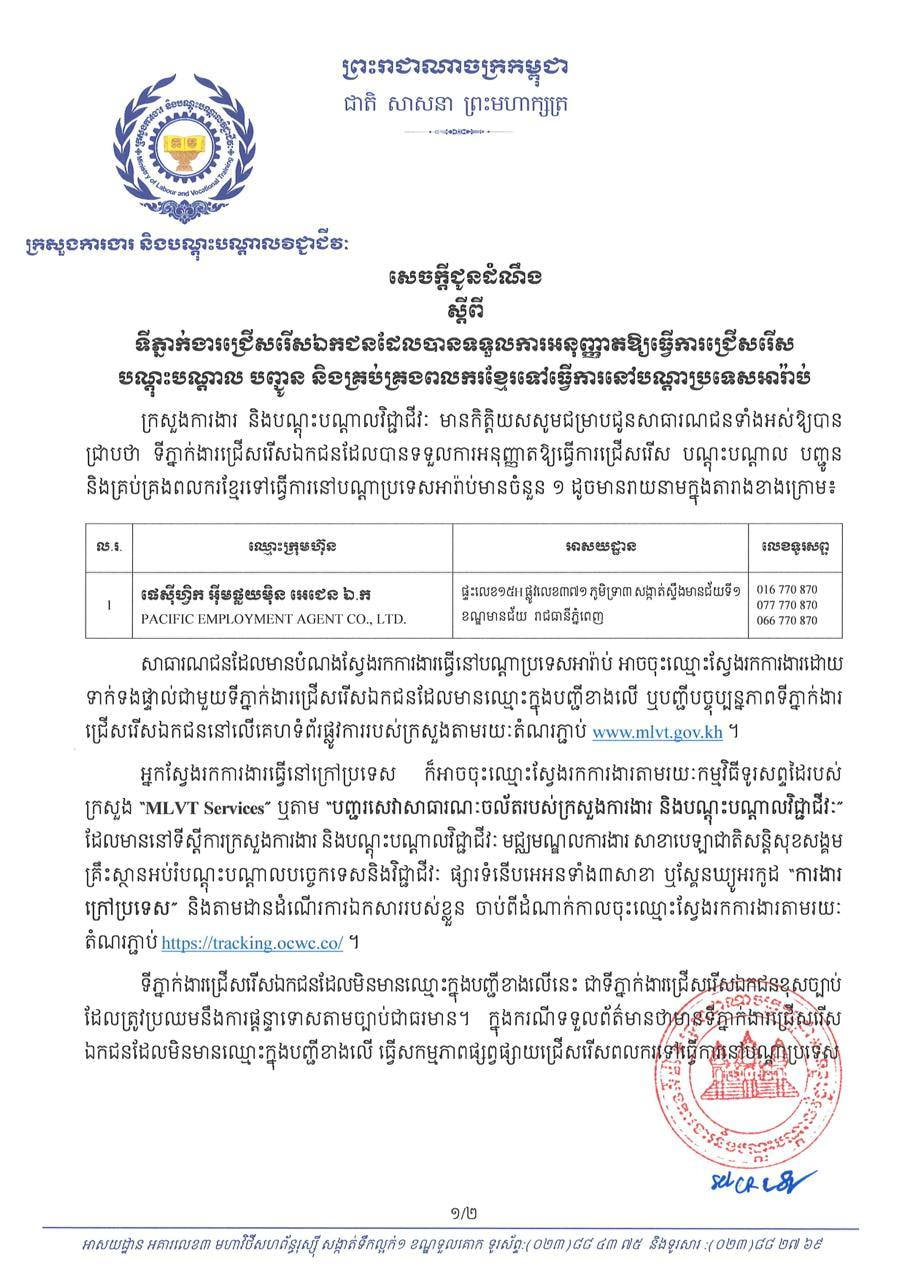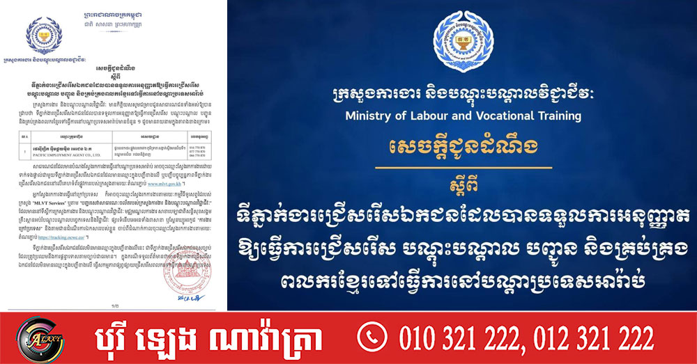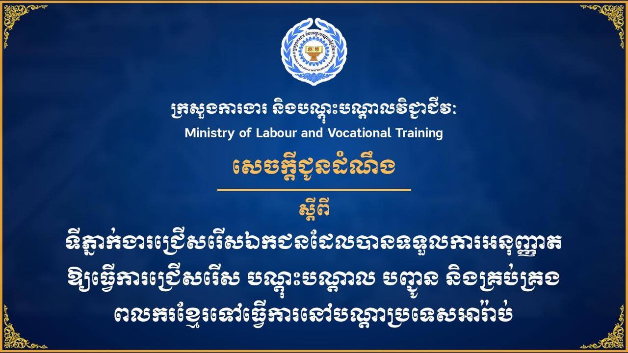 ក្រសួងការងារ ចេញសេចក្តីជូនដំណឹងស្តីពី ទីភ្នាក់ងារជ្រើសរើសឯកជន ដែលបានទទួលការអនុញ្ញាតឱ្យធ្វើការជ្រើសរើស បណ្តុះបណ្តាល បញ្ជូន និងគ្រប់គ្រងពលករខ្មែរទៅធ្វើការ នៅបណ្ដាប្រទេសអារ៉ាប់