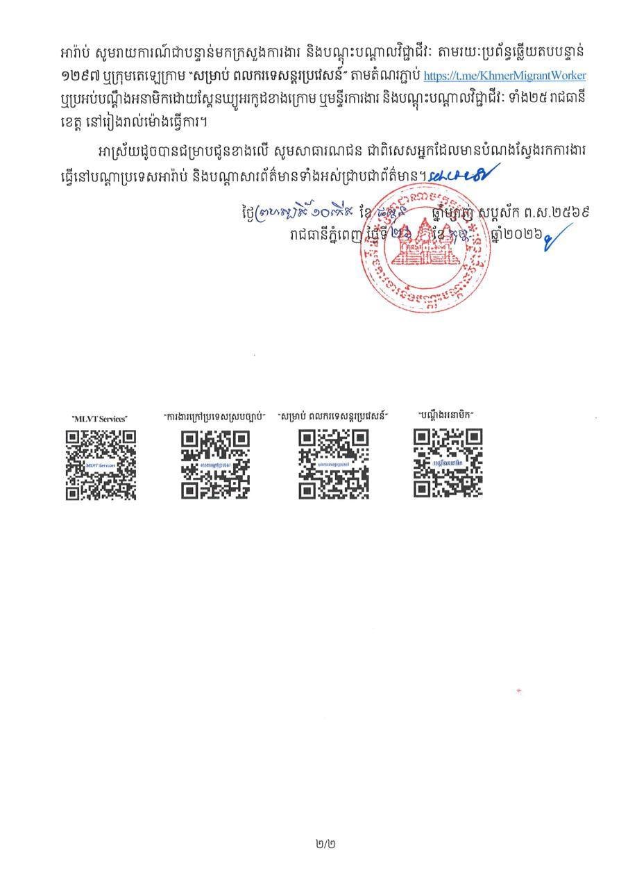ខាងក្រោមនេះ ជាសេចក្តីជូនដំណឹងរបស់ ក្រសួងការងារ និងបណ្តុះបណ្តាលវិជ្ជាជីវៈ៖