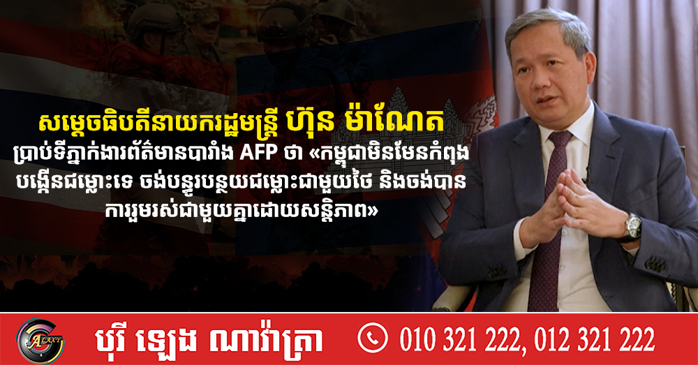 សម្តេចធិបតីនាយករដ្ឋមន្រ្តី ហ៊ុន ម៉ាណែត ប្រាប់ទីភ្នាក់ងារព័ត៌មានបារាំង AFP ថា «កម្ពុជាមិនមែនកំពុងបង្កើនជម្លោះទេ ចង់បន្ធូរបន្ថយជម្លោះជាមួយថៃ និងចង់បានការរួមរស់ជាមួយគ្នាដោយសន្តិភាព» (Video inside)
