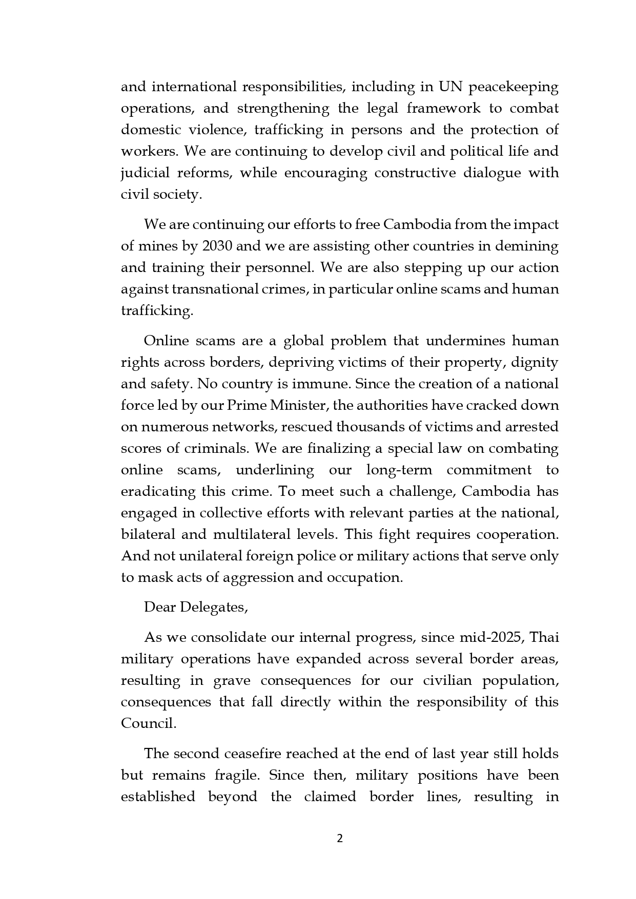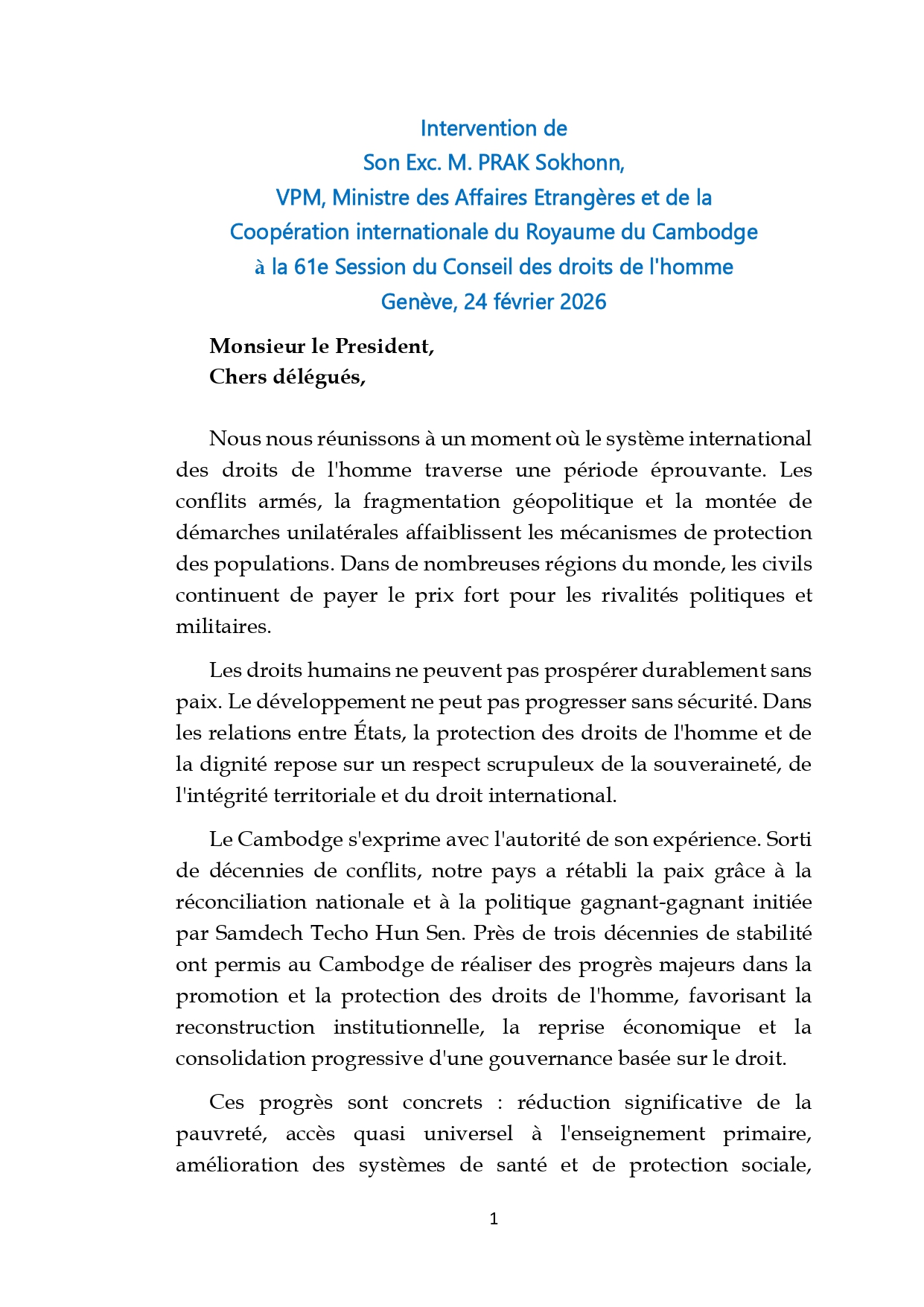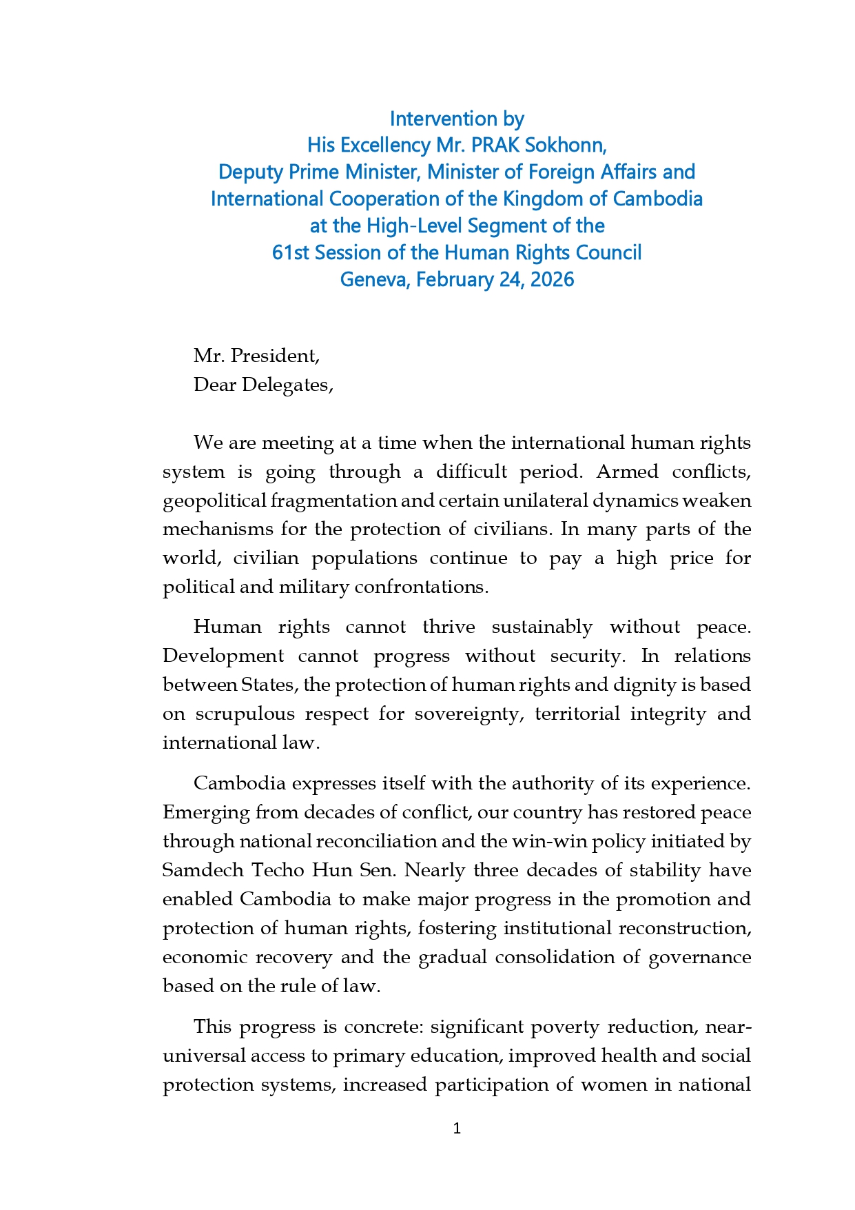 បទអន្តរាគមន៍របស់ ប្រមុខការទូតកម្ពុជា ក្នុងកិច្ចប្រជុំកម្រិតខ្ពស់នៃសម័យប្រជុំលើកទី៦១ របស់ក្រុមប្រឹក្សាសិទ្ធិមនុស្ស អ.ស.ប. ទីក្រុងហ្សឺណែវ ថ្ងៃទី ២៤ ខែកុម្ភៈ ឆ្នាំ២០២៦