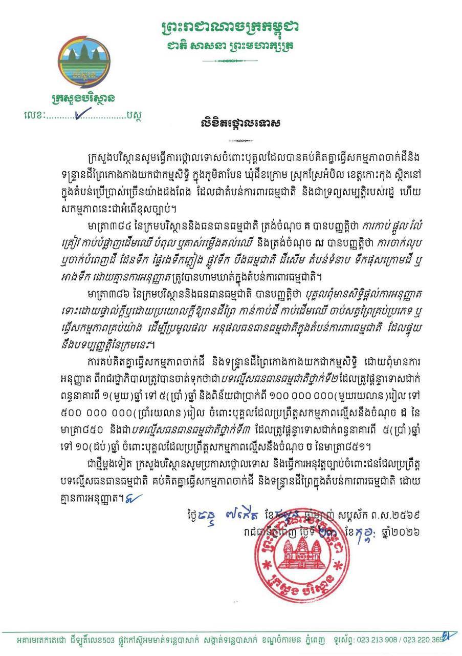 ស្របពេលជាមួយគ្នានេះ ក្រសួងបរិស្ថាន បានធ្វើការថ្កោលទោសចំពោះបុគ្គល ដែលបានគប់គិតគ្នាធ្វើសកម្មភាពចាក់ដី និងទន្ទ្រានដីព្រៃកោងកាងយកជាកម្មសិទ្ធិ ក្នុងភូមិតាបែន ឃុំជីខក្រោម ស្រុកស្រែអំបិល ខេត្តកោះកុង ស្ថិតនៅក្នុងតំបន់ប្រើប្រាស់ច្រើនយ៉ាងដងពែង ដែលជាតំបន់ការពារធម្មជាតិនៅក្នុងភូមិសាស្រ្តខេត្តកោះកុង៕