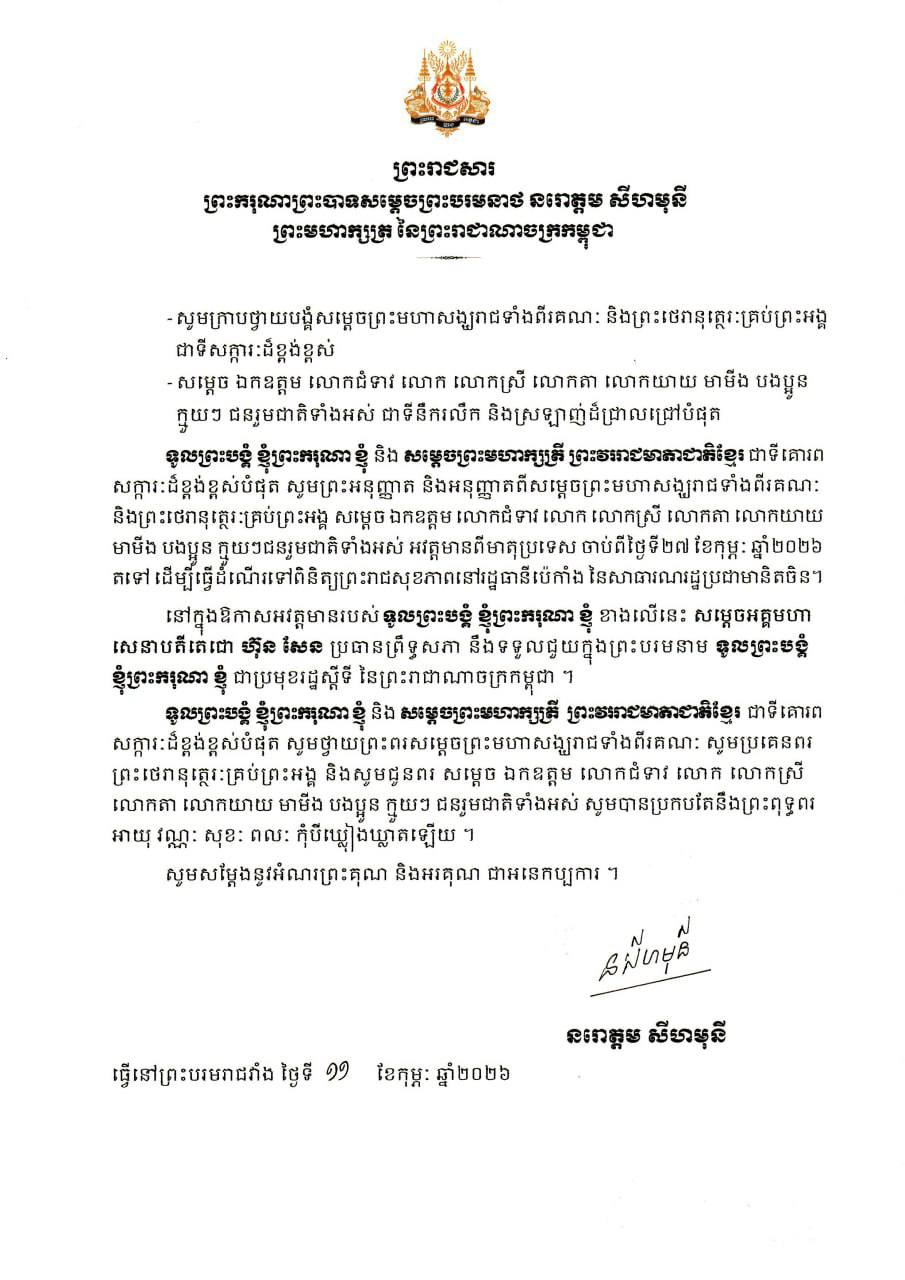 ក្នុងព្រះរាជសារ បានសរសេរថា «ទូលព្រះបង្គំ ខ្ញុំព្រះករុណា ខ្ញុំ និង សម្តេចព្រះមហាក្សត្រី ព្រះវររាជមាតាជាតិខ្មែរ ជាទីគោរព សក្ការៈដ៏ខ្ពង់ខ្ពស់បំផុត សូមព្រះអនុញ្ញាត និងអនុញ្ញាតពីសម្តេចព្រះមហាសង្ឃរាជ ទាំងពីរគណៈ និងព្រះថេរានុត្ថេរៈគ្រប់ព្រះអង្គ សម្តេច ឯកឧត្តម លោកជំទាវ លោក លោកស្រី លោកតា លោកយាយ មាមីង បងប្អូន ក្មួយៗជនរួមជាតិទាំងអស់ អវត្តមានពីមាតុប្រទេស ចាប់ពីថ្ងៃទី២៧ ខែកុម្ភៈ ឆ្នាំ២០២៦ តទៅ ដើម្បីធ្វើដំណើរទៅពិនិត្យព្រះរាជសុខភាពនៅរដ្ឋធានីប៉េកាំង នៃសាធារណរដ្ឋប្រជាមានិតចិន។