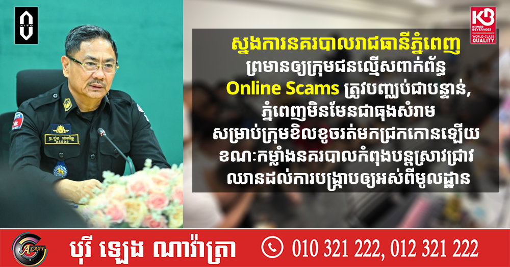 ស្នងការនគរបាលរាជធានីភ្នំពេញ ព្រមានឲ្យក្រុមជនល្មើសពាក់ព័ន្ធ Online Scams ត្រូវបញ្ឈប់ជាបន្ទាន់, ភ្នំពេញមិនមែនជាធុងសំរាមសម្រាប់ក្រុមខិលខូចរត់មកជ្រកកោនឡើយ ខណៈកម្លាំងនគរបាលកំពុងបន្តស្រាវជ្រាវ ឈានដល់ការបង្ក្រាបឲ្យអស់ពីមូលដ្ឋាន