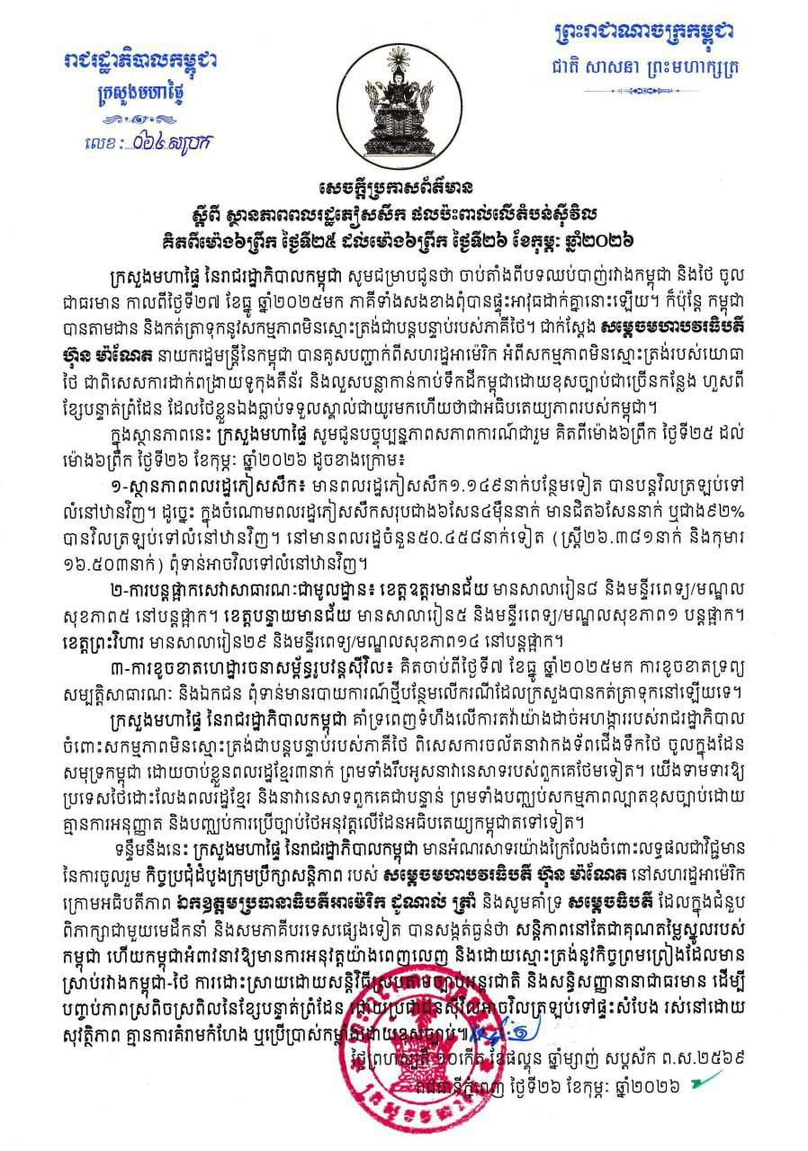 (ភ្នំពេញ)៖ ក្រសួងមហាផ្ទៃ នៅថ្ងៃទី២៦ ខែកុម្ភៈ ឆ្នាំ២០២៦នេះ បានឱ្យដឹងថា គិតចាប់ពីម៉ោង៦ព្រឹក ថ្ងៃទី២៥ ដល់ម៉ោង៦ព្រឹក ថ្ងៃទី២៦ ខែកុម្ភៈ ឆ្នាំ២០២៦នេះ មានប្រជាពលរដ្ឋភៀសសឹក ១ ១៤៩នាក់បន្ថែមទៀត បានវិលត្រឡប់ទៅលំនៅឋានវិញ។ ដូច្នេះក្នុងចំណោមពលរដ្ឋភៀសសឹកសរុបជាង ៦សែន ៤ម៉ឺននាក់ មានជិត ៦សែននាក់ ស្មើនឹងជាង ៩២ភាគរយ បានវិលត្រឡប់ទៅលំនៅឋានវិញ។