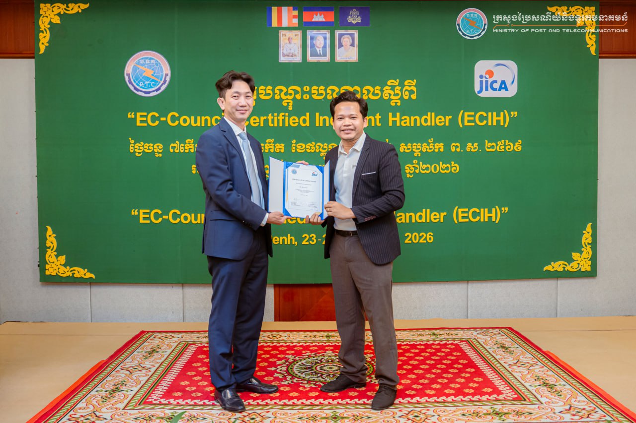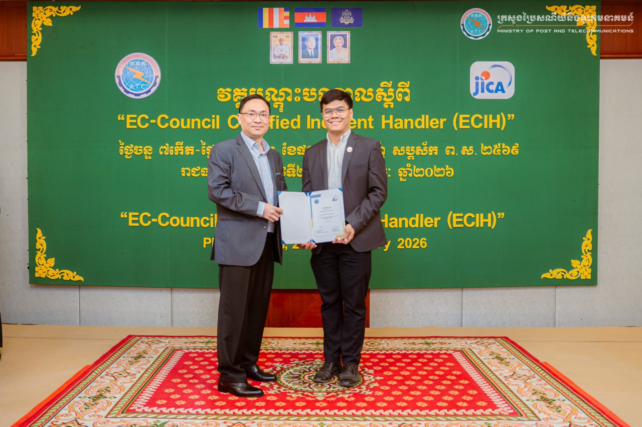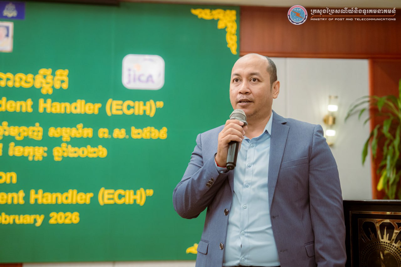 (ភ្នំពេញ)៖ លោក ខូវ មករា រដ្ឋលេខាធិការក្រសួងប្រៃសណីយ៍ និងទូរគមនាគមន៍ បានអញ្ជើញជាអធិបតីបិទវគ្គបណ្តុះបណ្តាល “EC-Council Certified Incident Handler (ECIH)” ដែលជាកម្មវិធីបណ្តុះបណ្តាលស៊ីជម្រៅ ផ្តោតលើការគ្រប់គ្រង និងការឆ្លើយតបទៅនឹងឧប្បត្តិហេតុសន្តិសុខសាយប័រ (Incident Response) ចាប់ពីថ្ងៃទី២៣-២៥ ខែកុម្ភៈ ឆ្នាំ២០២៦ និងមានការអញ្ជើញចូលរួមពីមន្ត្រី និងបុគ្គលិកជំនាញមកពី ១៩ ក្រសួង-ស្ថាប័នរដ្ឋ ប្រតិបត្តិករហេដ្ឋារចនាសម្ព័ន្ធព័ត៌មានសំខាន់ៗ ប្រតិបត្តិករសេវាអ៊ីនធឺណិត និងស្ថាប័នហិរញ្ញវត្ថុនិងធនាគារ សរុបប្រមាណ ៣០រូប នៅសណ្ឋាគារហ៊ីម៉ាវ៉ារី រាជធានីភ្នំពេញ។