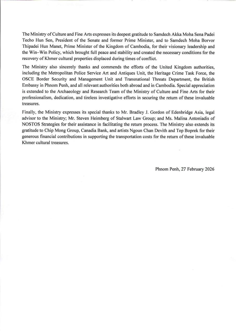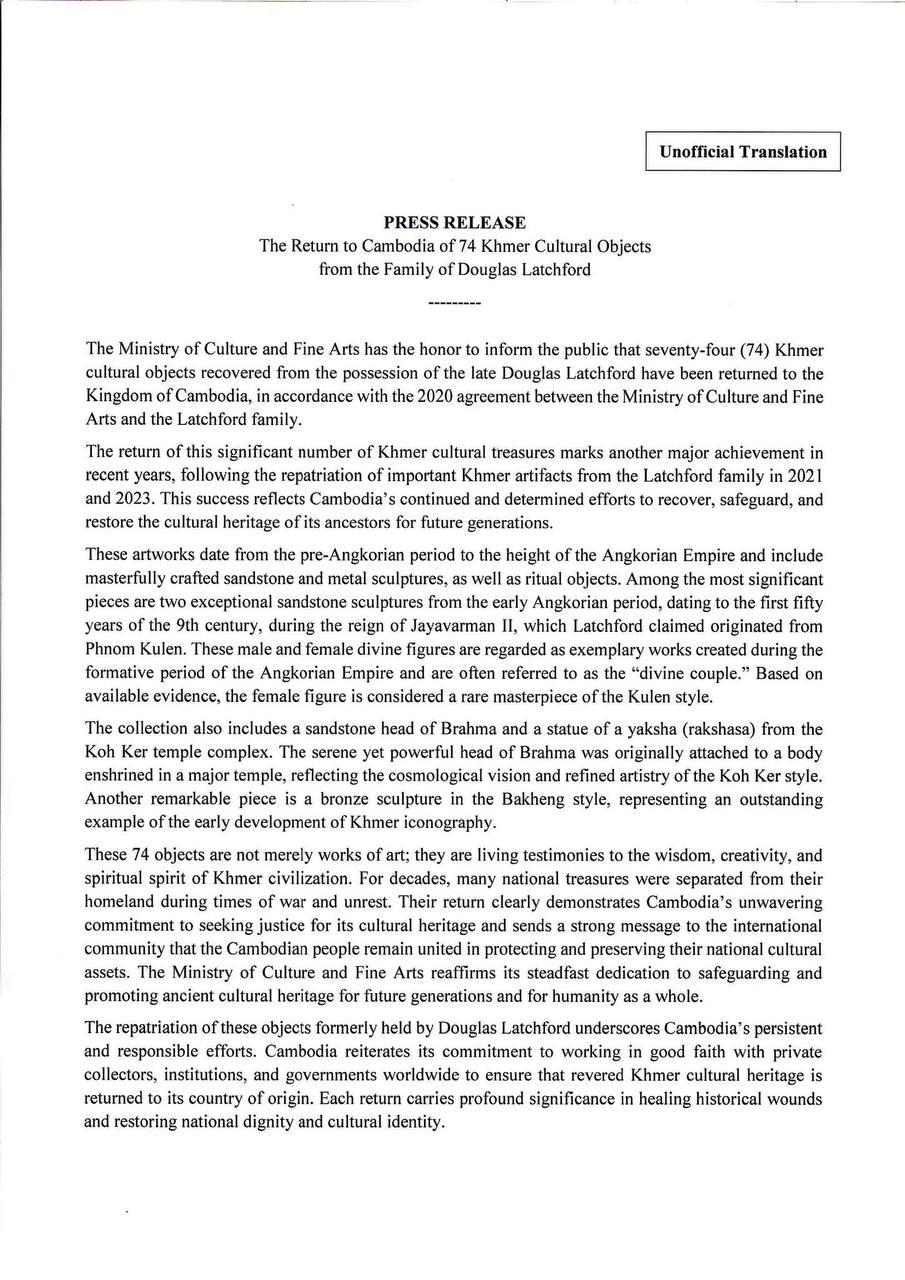 ការបញ្ជូនត្រឡប់មកវិញនូវមរតកវប្បធម៌ខ្មែរដែលមានចំនួនដ៏ច្រើននេះ គឺជាសមិទ្ធផលដ៏ធំធេងថ្មីមួយទៀត ក្នុងរយៈពេលប៉ុន្មានឆ្នាំចុងក្រោយនេះ បន្ទាប់ពីការបញ្ជូនវត្ថុបុរាណខ្មែរសំខាន់ៗមួយចំនួនពីគ្រួសារលោក ឡាចហ្វដ កាលពីឆ្នាំ២០២១ និងឆ្នាំ២០២៣ តាមរយៈកិច្ចខិតខំប្រឹងប្រែងជាប្រចាំរបស់កម្ពុជា ដើម្បីប្រមូលមកវិញ ថែរក្សា និងស្តារឡើងវិញនូវមរតកវប្បធម៌ដូនតាសម្រាប់កូនចៅជំនាន់ក្រោយ៕