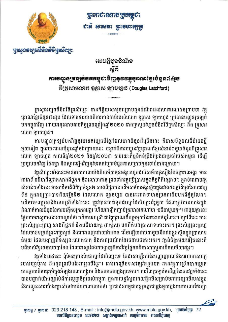 (ភ្នំពេញ)៖ ក្រសួងវប្បធម៌និងវិចិត្រសិល្បៈ បានជូនដំណឹងថា វត្ថុបុរាណខ្មែរចំនួន៧៤រូប ដែលទាមទារបានពីការកាន់កាប់របស់លោក ឌូគ្លាស ឡាចហ្វដ ត្រូវបានបញ្ជូនត្រឡប់មកកម្ពុជាវិញ ដោយអនុលោមតាមកិច្ចព្រមព្រៀងឆ្នាំ២០២០ រវាងក្រសួងវប្បធម៌និងវិចិត្រសិល្បៈ និង គ្រួសារលោក ឡាចហ្វដ។ នេះបើតាមសេចក្តីជូនដំណឹង ដែលបណ្តាញព័ត៌មាន Fresh News ទទួលបាន។