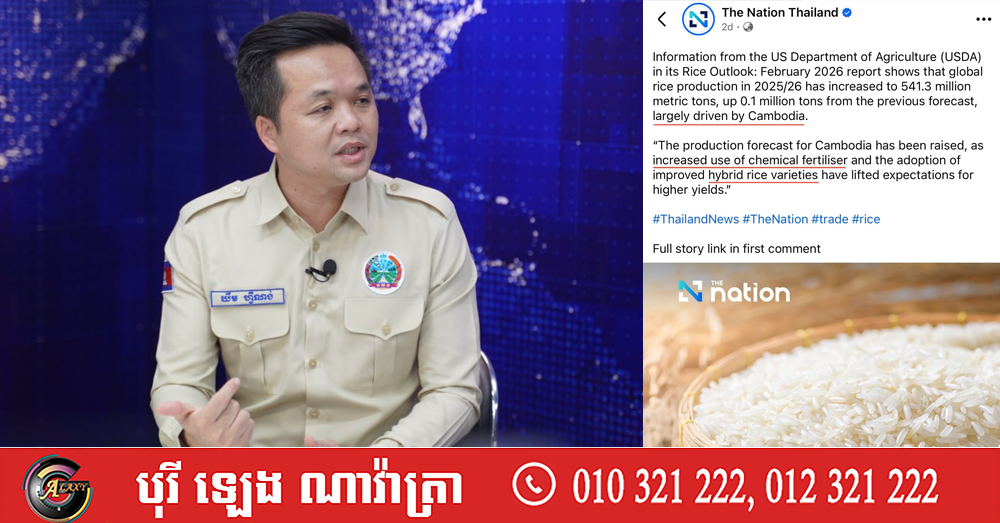 បើតាមអ្នកនាំពាក្យរូបនេះ, នាថ្មីៗនេះ សារព័ត៌មាន The Nation Thailand បានចុះផ្សាយអំពីរបាយការណ៍ Rice Outlook – February 2026 របស់ក្រសួងកសិកម្មអាមេរិក (USDA) ដែលបានបង្ហាញពីការកើនឡើងនៃបរិមាណផលស្រូវរបស់កម្ពុជា ហើយបានសន្និដ្ឋានថា កំណើននេះគឺដោយសារការបង្កើនការប្រើប្រាស់ជី និងការប្រើប្រាស់ពូជស្រូវ Hybrid។ នៅក្នុងការចុះផ្សាយនោះ The Nation Thailand បានបន្ថែមពាក្យ «ជីគីមី» ដែលមានខ្លឹមសារឃ្លាតចាកពីរបាយការណ៍ដើម។