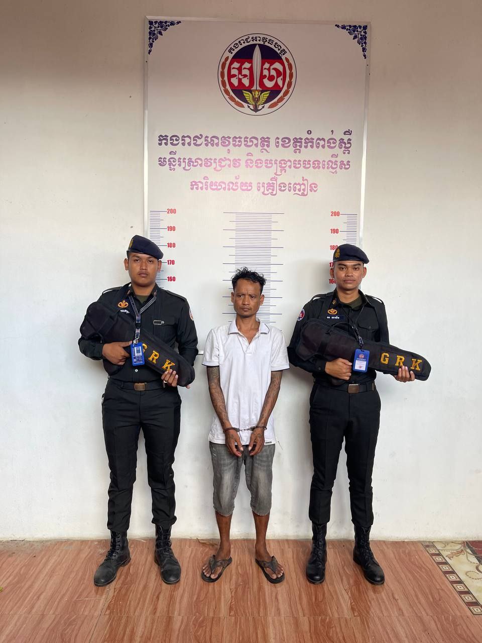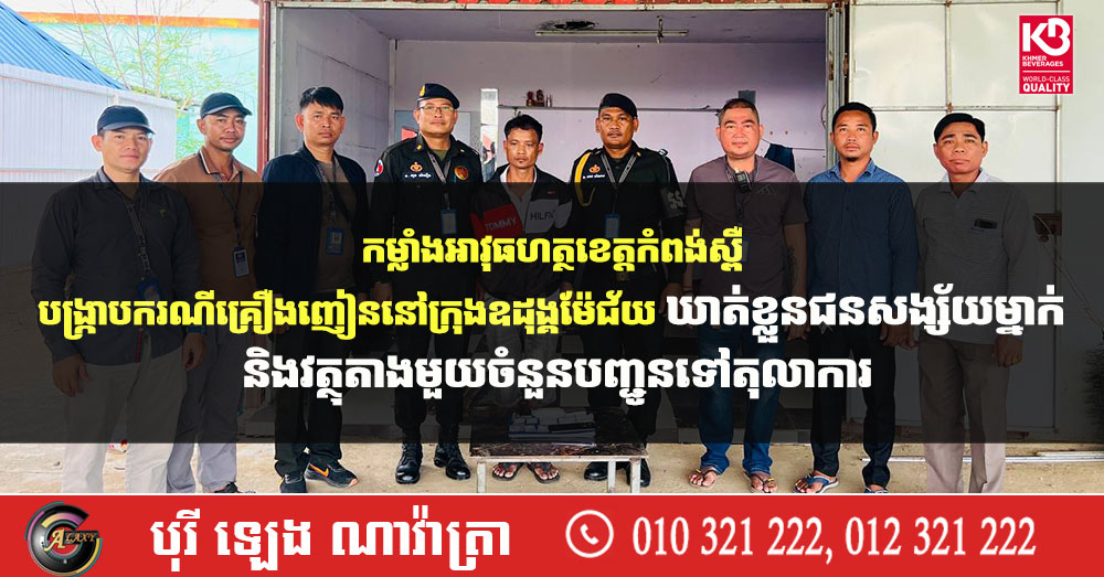 (កំពង់ស្ពឺ)៖ ដោយមានការចង្អុលបង្ហាញ និងអនុវត្តតាមបញ្ជាយ៉ាងមុឺងម៉ាត់របស់លោកឧត្តមសេនីយ៍ត្រី ម៉េង ស្រ៊ុន មេបញ្ជាការកងរាជអាវុធហត្ថខេត្តកំពង់ស្ពឺ និងមានការសម្របសម្រួលនីតិវិធីពីព្រះរាជអាជ្ញា នៃអយ្យការអមសាលាដំបូងខេត្តកំពង់ស្ពឺ នៅថ្ងៃទី៣ ខែមីនា ឆ្នាំ២០២៦កន្លងមកនេះ កម្លាំងការិយាល័យប្រឆាំងគ្រឿងញៀន បានសហការជាមួយកម្លាំងមូលដ្ឋានកងរាជអាវុធហត្ថ ក្រុងឧដុង្គម៉ែជ័យ ដឹកនាំដោយលោកវរសេនីយ៍ត្រី សេង រ៉ាម៉ូវ មេបញ្ជាការមូលដ្ឋានកងរាជអាវុធហត្ថខេត្តក្រុងឧដុង្គម៉ែជ័យ បានឃាត់ខ្លួនជនសង្ស័យម្នាក់ស្ថិតនៅក្នុងភូមិក្រាំងពន្លៃ សង្កាត់វាំងចាស់ ក្រុងឧដុង្គម៉ែជ័យ។