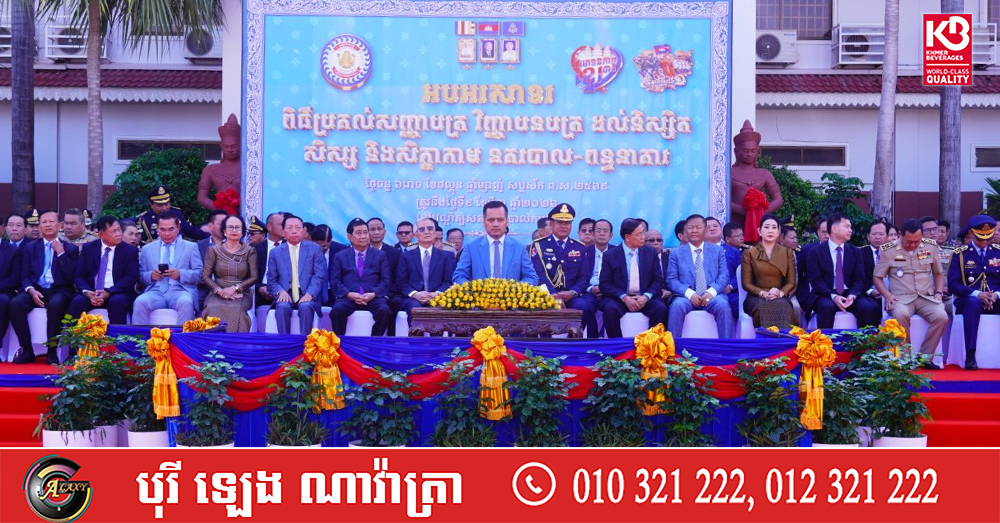 (កណ្ដាល)៖ លោកអភិសន្តិបណ្ឌិត ស សុខា ឧបនាយករដ្ឋមន្ត្រី រដ្ឋមន្ត្រីក្រសួងមហាផ្ទៃ បានណែនាំនិស្សិតដែលទទួលបានជ័យលាភី បញ្ចប់ការសិក្សាវគ្គជំនាញនគរបាលទាំងអស់ សូមយកចំណេះដឹង ជំនាញរបស់ខ្លួន ពិសេសក្រមសីលធម៌ ទៅបម្រើពលរដ្ឋតាមមូលដ្ឋានរៀងៗខ្លួន សូមប្រកបដោយប្រសិទ្ធភាព គុណភាព ប្រសិទ្ធភាពលើការបម្រើ និងរកសេចក្ដីសុខជូនពលរដ្ឋឲ្យបានល្អប្រសើរបំផុត។ លើសនេះ ការប្រើប្រាស់ពាក្យសំដីត្រូវប្រយ័ត្ន ព្រោះសំដីខុសឆ្គងអាចត្រូវបានមហាជនវាយតម្លៃមិនល្អមកលើនគរបាល។