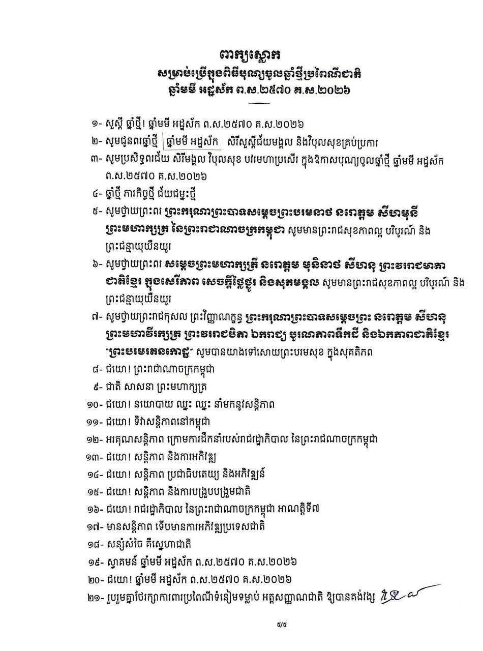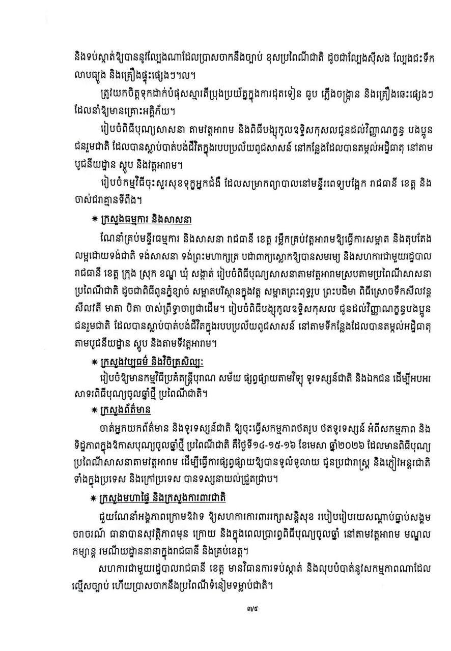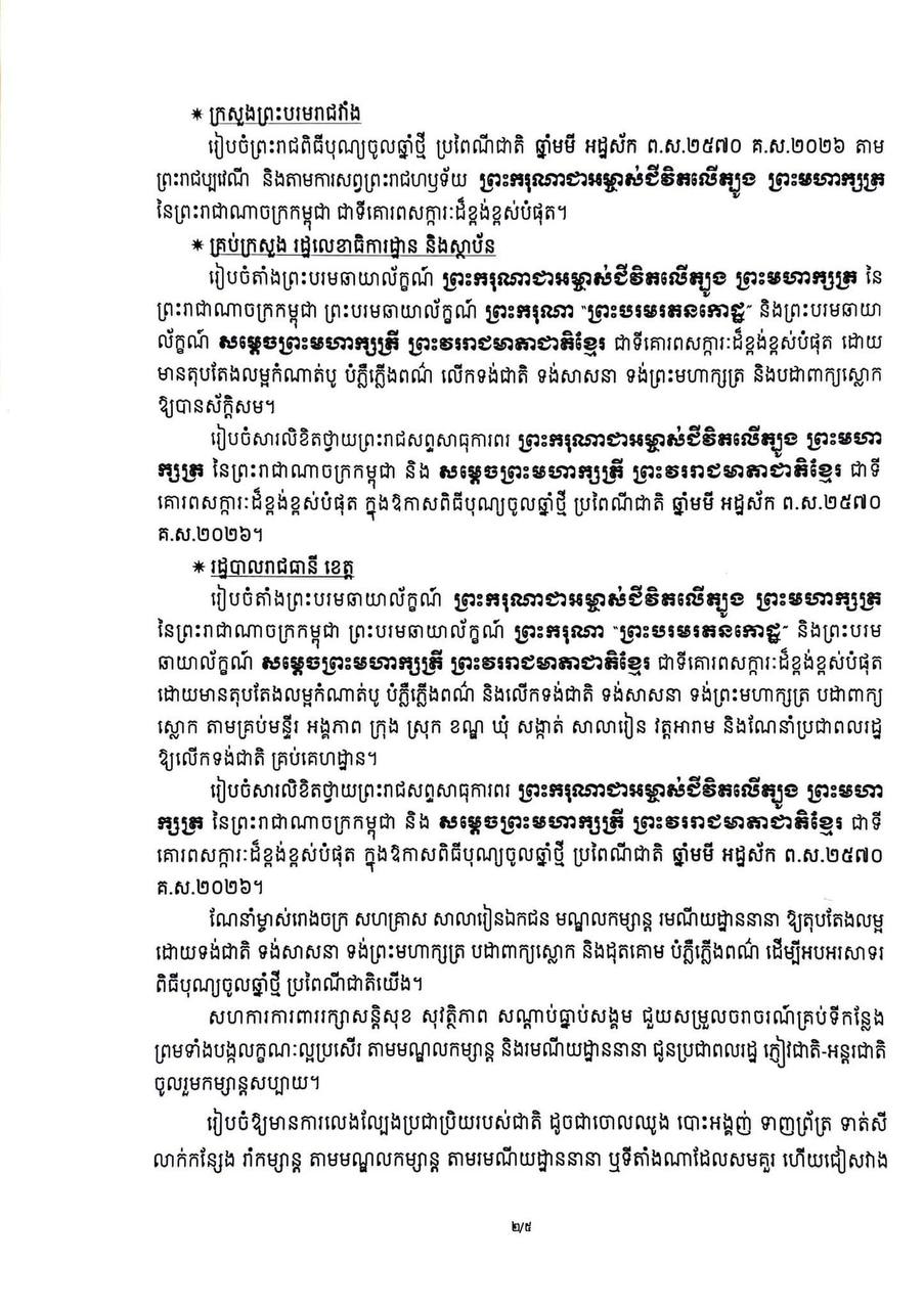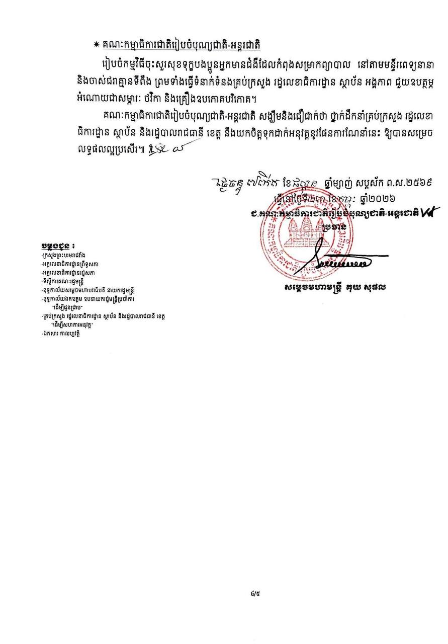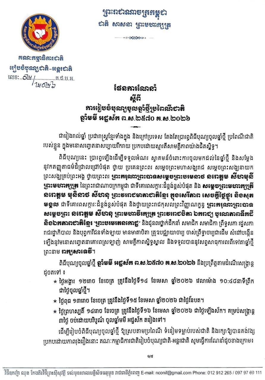 (ភ្នំពេញ)៖ គណៈកម្មាធិការជាតិរៀបចំបុណ្យជាតិ-អន្តរជាតិ បានចេញផែនការណែនាំស្តីពីការរៀបចំបុណ្យចូលឆ្នាំថ្មី ប្រពៃណីជាតិ ឆ្នាំមមី អដ្ឋស័ក ព.ស.២៥៧០ គ.ស.២០២៦។ នេះបើតាមសេចក្តីណែនាំដែលបណ្តាញព័ត៌មាន Fresh News ទទួលបាននៅថ្ងៃទី០៩ ខែមីនា ឆ្នាំ២០២៦។