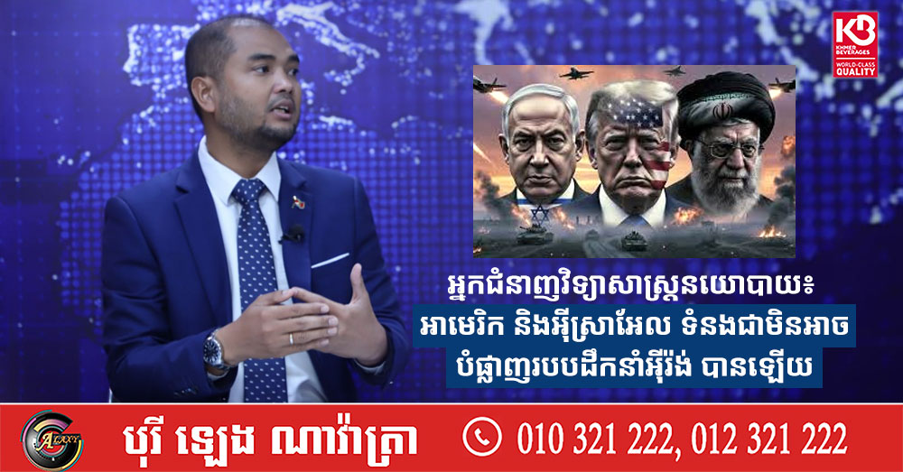 (ភ្នំពេញ)៖ ការរួមដៃគ្នាក្នុងការវាយប្រហារអ៊ីរ៉ង់ នៅក្នុងប្រតិបត្តិការ «តោក្រហឹម» រវាងអាមេរិក និងអ៊ីស្រាអែល ទំនងជាមិនអាចបំផ្លាញរបបដឹកនាំអ៊ីស្លាមអ៊ីរ៉ង់ តាមការចង់បានឡើយ នេះបើតាមការបញ្ជាក់ពីលោកបណ្ឌិត ញិល រដ្ឋា អ្នកជំនាញវិទ្យាសាស្ត្រនយោបាយ និងសេដ្ឋកិច្ច នៅក្នុងកិច្ចពិភាក្សា Fresh Talk នាថ្ងៃសៅរ៍សប្ដាហ៍កន្លងទៅ។