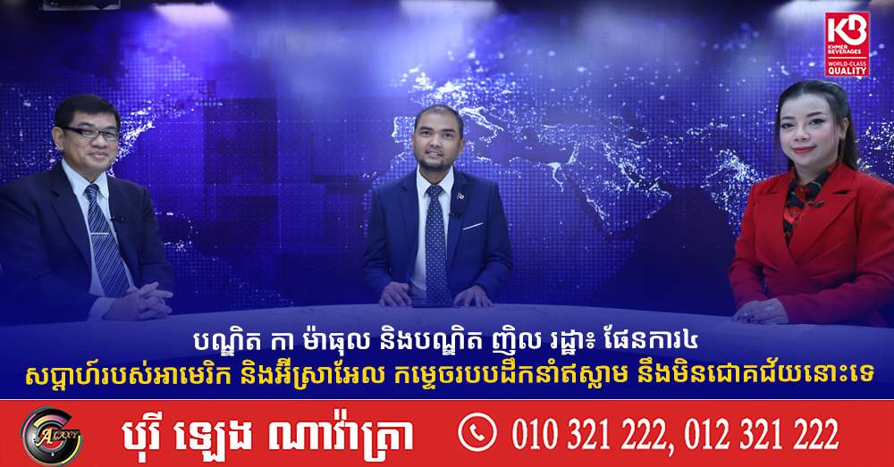 (ភ្នំពេញ)៖ លោកបណ្ឌិត កា ម៉ាធុល អ្នកជំនាញវិទ្យាសាស្រ្តនយោបាយ បានយល់ឃើញថាផែនការ៤សប្ដាហ៍របស់អាមេរិកនិងអ៊ីស្រាអែល កម្ទេចរបបដឹកនាំឥស្លាម នឹងមិនជោគជ័យនោះទេ ខណៈលោកបណ្ឌិត ញិល រដ្ឋា មានសេណារីយ៉ូ៣ដែលអាចកើតឡើងក្នុងសង្រ្គាមនៅអ៊ីរ៉ង់ ប៉ុន្តែសេណារីយ៉ូ កម្ទេចអ៊ីរ៉ង់ក្នុងរយៈពេល៤សប្ដាហ៍របស់អាមេរិកនិងអ៊ីស្រាអែល បានបរាជ័យរួចទៅហើយ។ ការបញ្ជាក់របស់លោកបណ្ឌិតទាំង២រូប បានធ្វើឡើងនៅក្នុងកិច្ចពិភាក្សា Fresh Talk នាថ្ងៃសៅរ៍សប្ដាហ៍កន្លងទៅ។