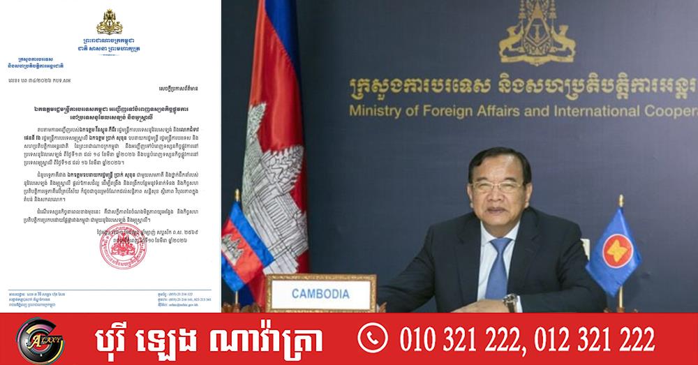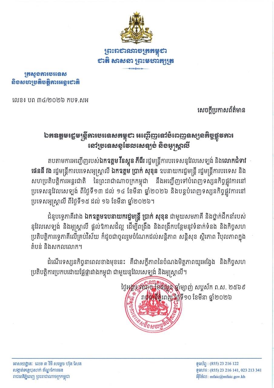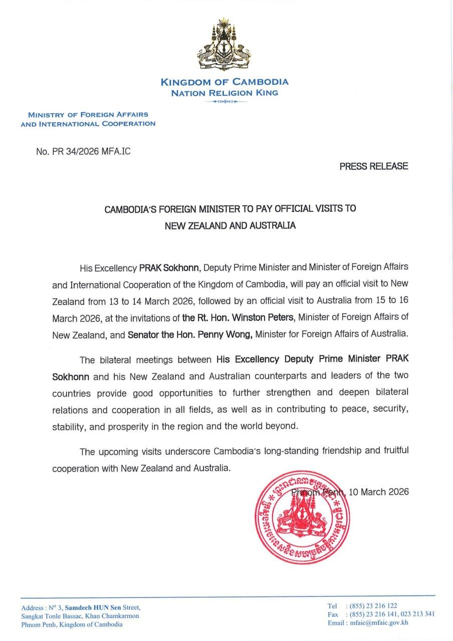 (ភ្នំពេញ)៖ តបតាមការអញ្ជើញរបស់លោក វីនស្តុន ភីធឺរ រដ្ឋមន្ត្រីការបរទេសនូវែលសេឡង់ និងលោកស្រី ផេននី វង រដ្ឋមន្ត្រីការបរទេសអូស្ត្រាលី, លោក ប្រាក់ សុខុន ឧបនាយករដ្ឋមន្ត្រី រដ្ឋមន្ត្រីការបរទេស និង សហប្រតិបត្តិការអន្តរជាតិ នៃព្រះរាជាណាចក្រកម្ពុជា នឹងអញ្ជើញទៅបំពេញទស្សនកិច្ចផ្លូវការ ប្រទេសនូវែលសេឡង់ ពីថ្ងៃទី១៣ ដល់ ១៤ ខែមីនា ឆ្នាំ២០២៦ និងបន្តបំពេញទស្សនកិច្ចផ្លូវការនៅ ប្រទេសអូស្ត្រាលី ពីថ្ងៃទី១៥ ដល់ ១៦ ខែមីនា ឆ្នាំ២០២៦។