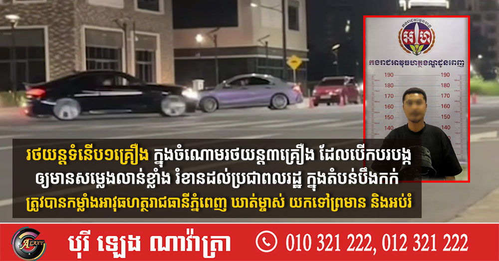 រថយន្តទំនើប១គ្រឿង ក្នុងចំណោមរថយន្ត៣គ្រឿង ដែលបើកបរបង្កឲ្យមានសម្លេងលាន់ខ្លាំង រំខានដល់ប្រជាពលរដ្ឋ ក្នុងតំបន់បឹងកក់ ត្រូវបានកម្លាំងអាវុធហត្ថរាជធានីភ្នំពេញ ឃាត់ម្ចាស់ យកទៅព្រមាន និងអប់រំ