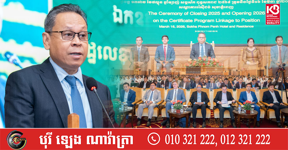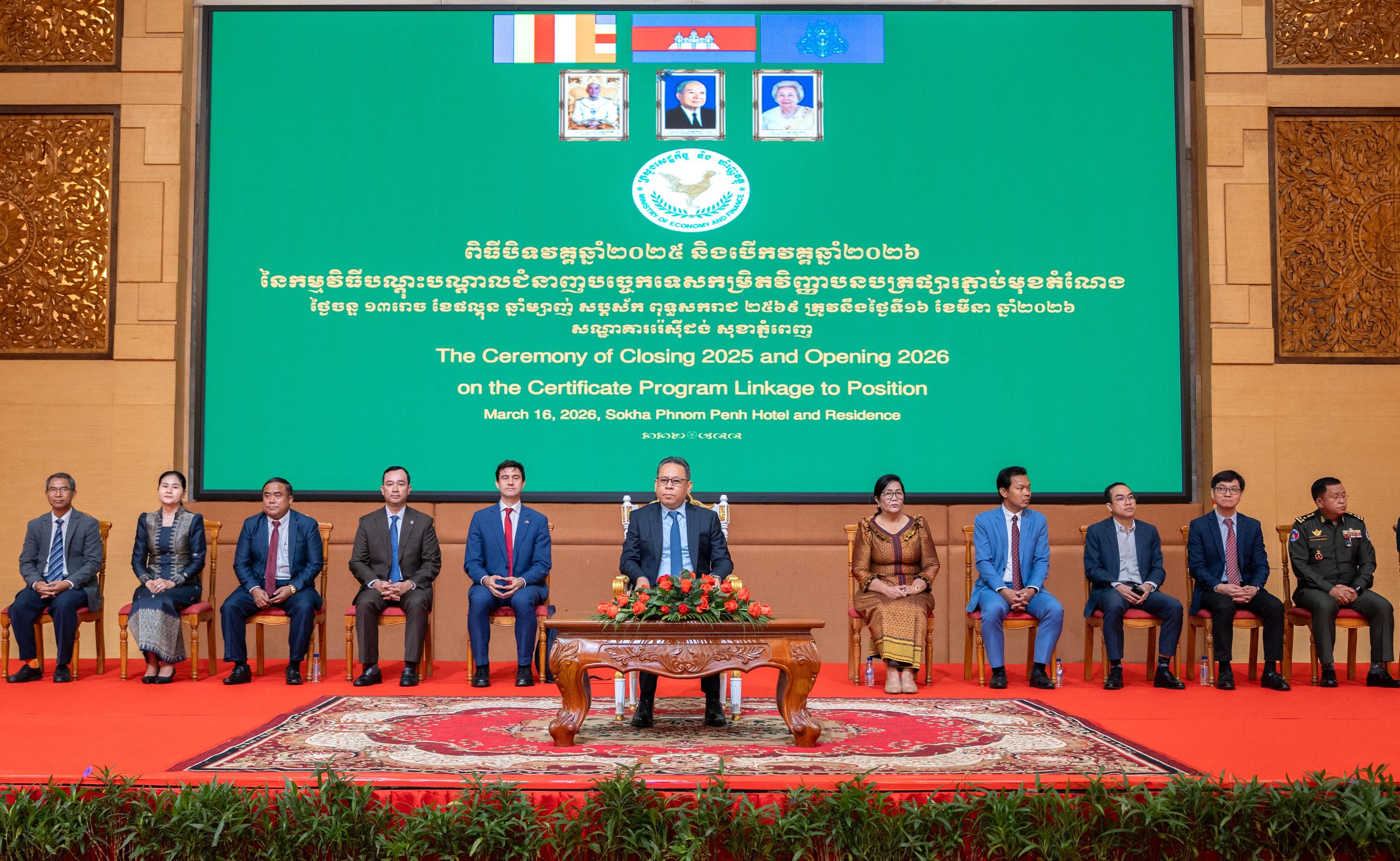 (ភ្នំពេញ)៖ ក្រសួងសេដ្ឋកិច្ច និងហិរញ្ញវត្ថុ នៅព្រឹកថ្ងៃទី ១៦ ខែមីនា ឆ្នាំ ២០២៦ បានរៀបចំពិធីបិទវគ្គសិក្សាឆ្នាំ ២០២៥ និងបើកវគ្គសិក្សាឆ្នាំ ២០២៦ នៃ «កម្មវិធីបណ្ដុះបណ្ដាលកម្រិតវិញ្ញាបនបត្រផ្សារភ្ជាប់មុខតំណែង» ដោយមានការចូលរួមពីសិក្ខាកាមជ័យលាភីឆ្នាំ ២០២៥ និង សិក្ខាកាមគោលដៅឆ្នាំ ២០២៦ ជាមន្រ្តីអនុវត្តការងារហិរញ្ញវត្ថុសាធារណៈ មកពីក្រសួងស្ថាប័ន រួមទាំងមន្ទីរជំនាញ, គ្រឹះស្ថានសាធារណៈរដ្ឋបាល និង រដ្ឋបាលរាជធានី-ខេត្តទាំង ២៥។