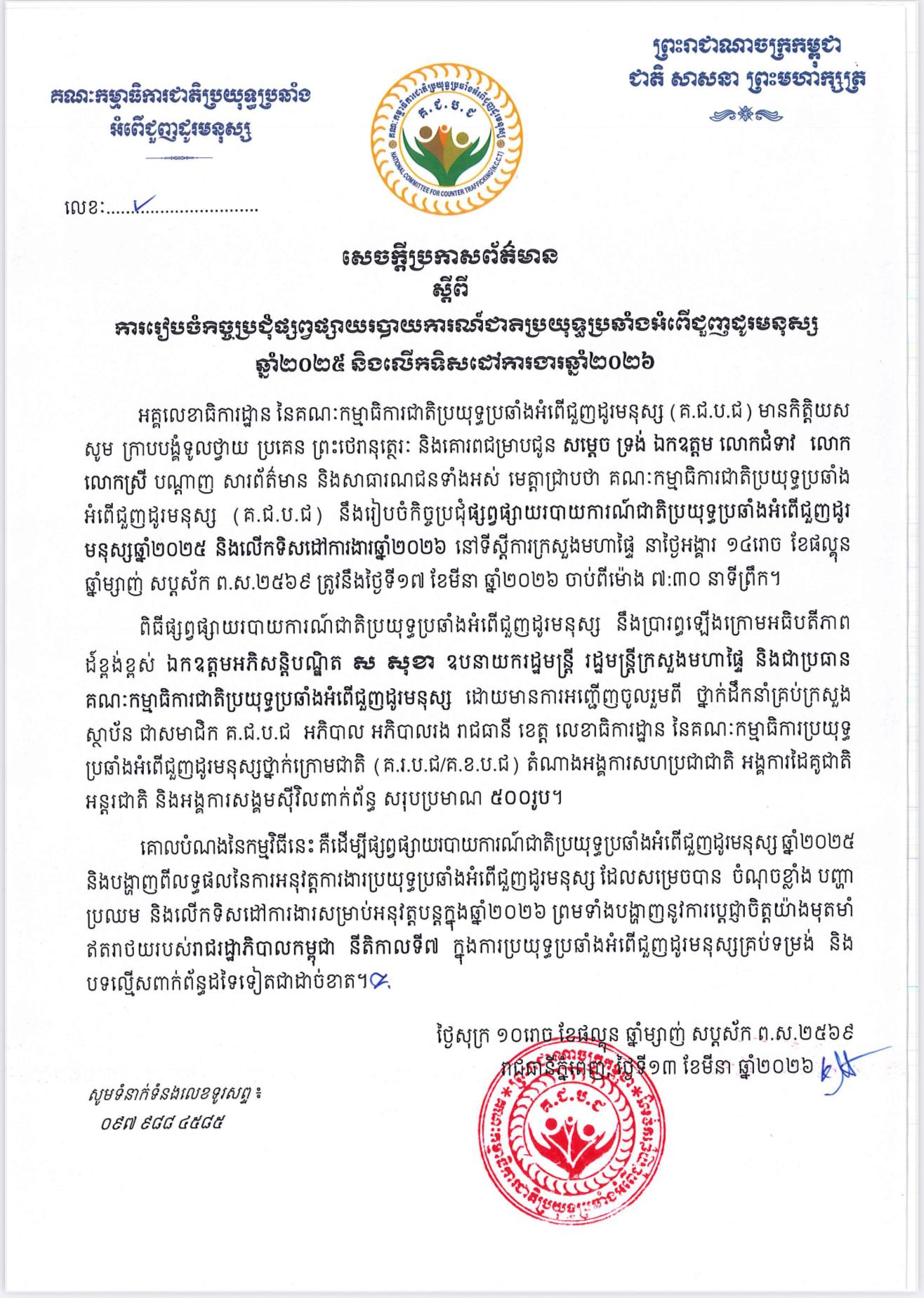 (ភ្នំពេញ)៖ គណៈកម្មាធិការជាតិប្រយុទ្ធប្រឆាំងអំពើជួញដូរមនុស្ស (គ.ជ.ប.ជ) នឹងរៀបចំកិច្ចប្រជុំផ្សព្វផ្សាយរបាយការណ៍ជាតិប្រយុទ្ធប្រឆាំងអំពើជួញដូរមនុស្សឆ្នាំ២០២៥ និងលើកទិសដៅការងារឆ្នាំ២០២៦ នៅទីស្តីការក្រសួងមហាផ្ទៃ នាថ្ងៃអង្គារ១៤រោច ខែផល្គុន ឆ្នាំម្សាញ់ សប្ដស័ក ព.ស.២៥៦៩ ត្រូវនឹងថ្ងៃទី១៧ ខែមីនា ឆ្នាំ២០២៦ស្អែកនេះ។