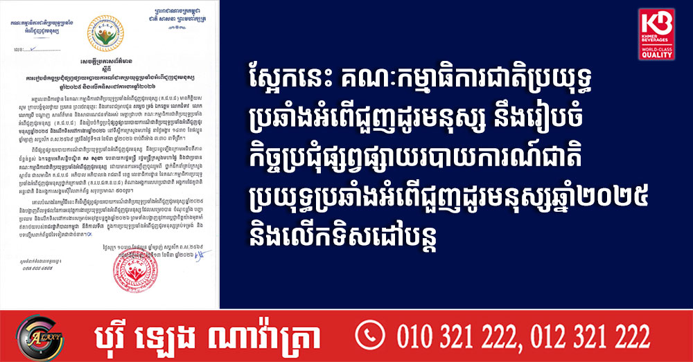 ស្អែកនេះ គណៈកម្មាធិការជាតិប្រយុទ្ធប្រឆាំងអំពើជួញដូរមនុស្ស នឹងរៀបចំកិច្ចប្រជុំផ្សព្វផ្សាយរបាយការណ៍ជាតិប្រយុទ្ធប្រឆាំងអំពើជួញដូរមនុស្សឆ្នាំ២០២៥ និងលើកទិសដៅបន្ដ