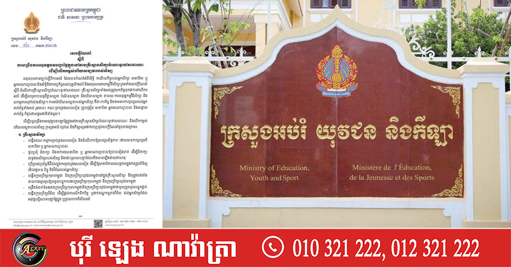 (ភ្នំពេញ)៖ ក្រសួងអប់រំ យុវជន និងកីឡា បានចេញសេចក្ដីណែនាំថ្មីមួយ ស្ដីពីការពង្រឹងការអនុវត្ដបទបញ្ជាផ្ទៃក្នុង នៅតាមគ្រឹះស្ថានសិក្សាចំណេះទូទៅសាធារណៈដើម្បីលើកកម្ពស់ចរិយាសម្បទារបស់សិស្ស។