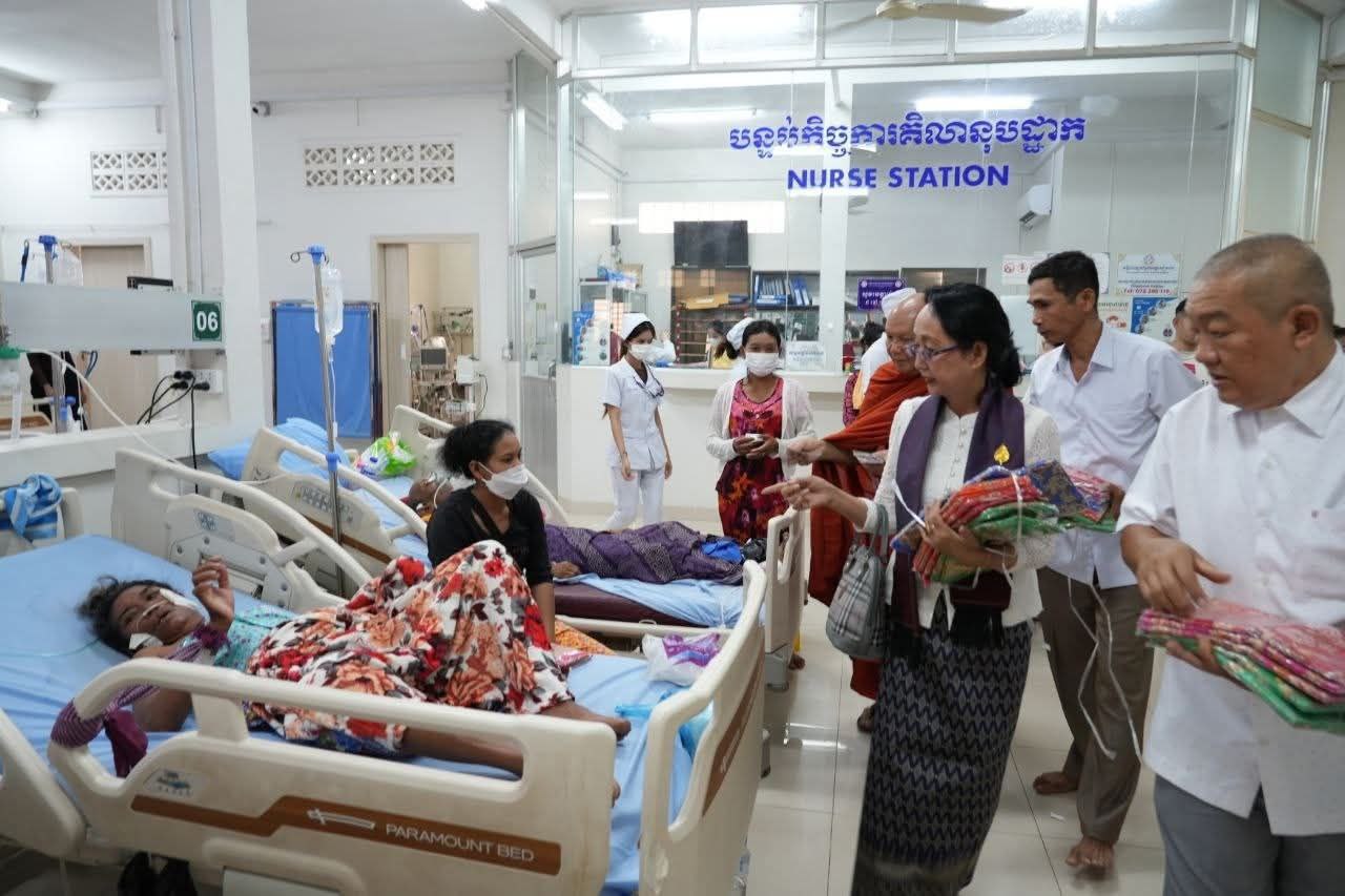 សូមជម្រាបថា បន្ទាប់ពីការប្រគល់សម្ភារជូនមន្ទីរពេទ្យ ព្រះបាឡាត់គណខេត្ត រួមជាមួយពុទ្ធបរិស័ទ ក៏បាននិមន្តចុះសួរសុខទុក្ខអ្នកជំងឺដែលកំពុងសម្រាកព្យាបាលនៅសាលសង្គ្រោះបន្ទាន់ផងដែរ។ ក្នុងនោះ ព្រះអង្គបានចែកជូននូវសារុង និងថវិកាដល់អ្នកជំងឺ និងសាច់ញាតិដែលមកកំដរ ព្រមទាំងផ្ដល់ជូនថវិកាលើកទឹកចិត្ត ដល់កម្មករដែលបម្រើការងារក្នុងមន្ទីរពេទ្យផងដែរ៕
