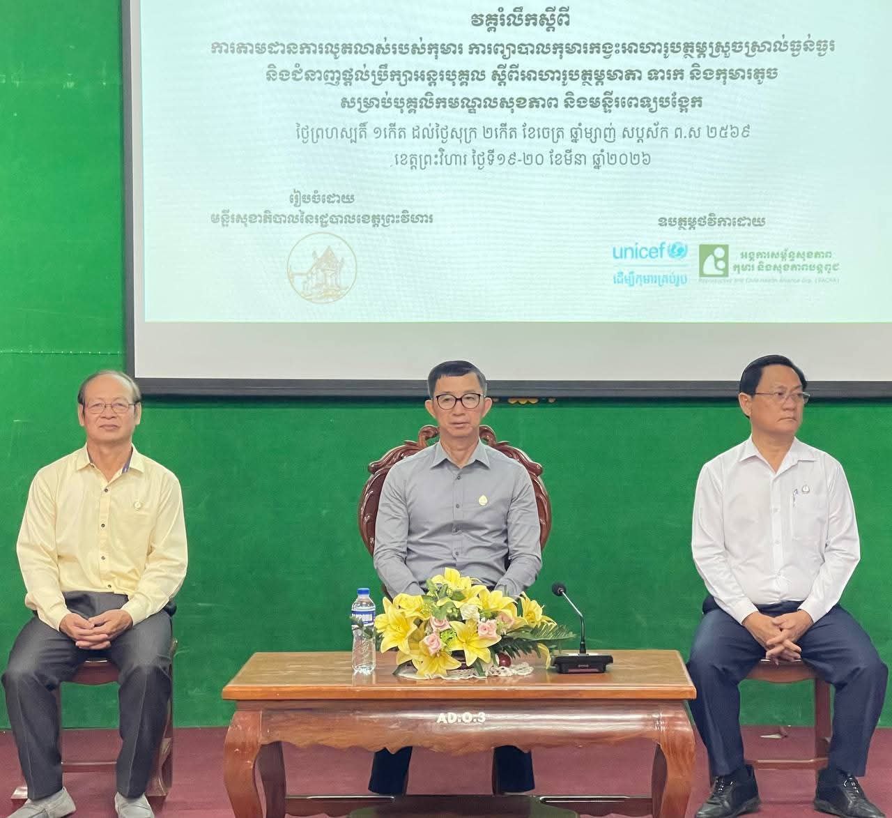 (ព្រះវិហារ)៖ លោកវេជ្ជបណ្ឌិត គួង ឡូ ទីប្រឹក្សាក្រសួងសុខាភិបាល និងជាប្រធានមន្ទីរសុខាភិបាលខេត្តព្រះវិហារ បានថ្លែងអំពាវនាវឱ្យពង្រឹងការយល់ដឹងអាហារូបត្ថម្ភកុមារ និងលើកកម្ពស់គុណភាពសេវាសុខាភិបាល នៅខេត្តព្រះវិហារ។