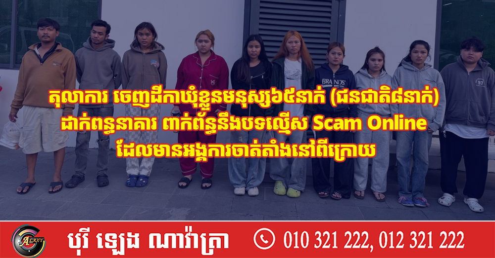 តុលាការ ចេញដីកាឃុំខ្លួនមនុស្ស៦៥នាក់ (ជនជាតិ៨នាក់) ដាក់ពន្ធនាគារ ពាក់ព័ន្ធនឹងបទល្មើស Scam Online ដែលមានអង្គការចាត់តាំងនៅពីក្រោយ