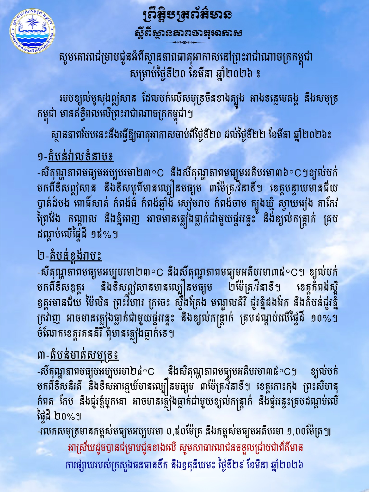 ក្រសួងធនធានទឹក ជូនដំណឹងអំពីស្ថានភាពធាតុអាកាសនៅកម្ពុជា សម្រាប់ថ្ងៃទី២០ ខែមីនា ឆ្នាំ២០២៦