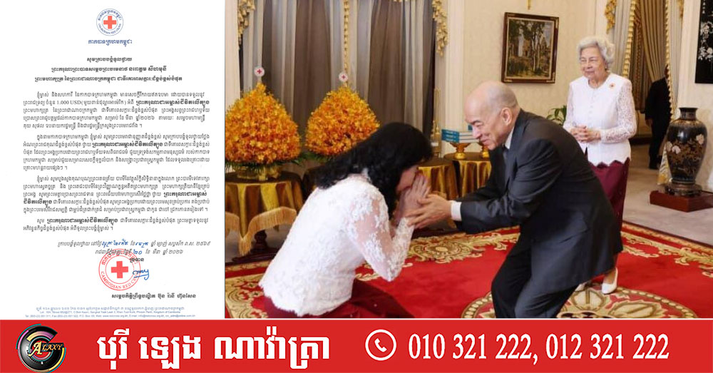 (ភ្នំពេញ)៖ សម្ដេចកិត្តិព្រឹទ្ធបណ្ឌិត ប៊ុន រ៉ានី ហ៊ុនសែន ប្រធានកាកបាទក្រហមកម្ពុជា នៅថ្ងៃទី២០ ខែមីនា ឆ្នាំ២០២៦នេះ បានក្រាបបង្គំទូលថ្វាយនូវសារលិខិតថ្លែងអំណរព្រះរាជគុណថ្វាយ ព្រះករុណា ព្រះបាទសម្តេចព្រះបរមនាថ នរោត្តម សីហមុនី ព្រះមហាក្សត្រនៃព្រះរាជាណាចក្រកម្ពុជា ជាទីគោរពសក្ការៈដ៏ខ្ពង់ខ្ពស់បំផុត ដែលព្រះអង្គសព្វព្រះរាជហឫទ័យ ប្រោសព្រះរាជូបត្ថម្ភនូវព្រះរាជទ្រព្យចំនួន ១ពាន់ដុល្លារ ចំពោះកាកបាទក្រហមកម្ពុជា សម្រាប់ខែមីនា ឆ្នាំ២០២៦។