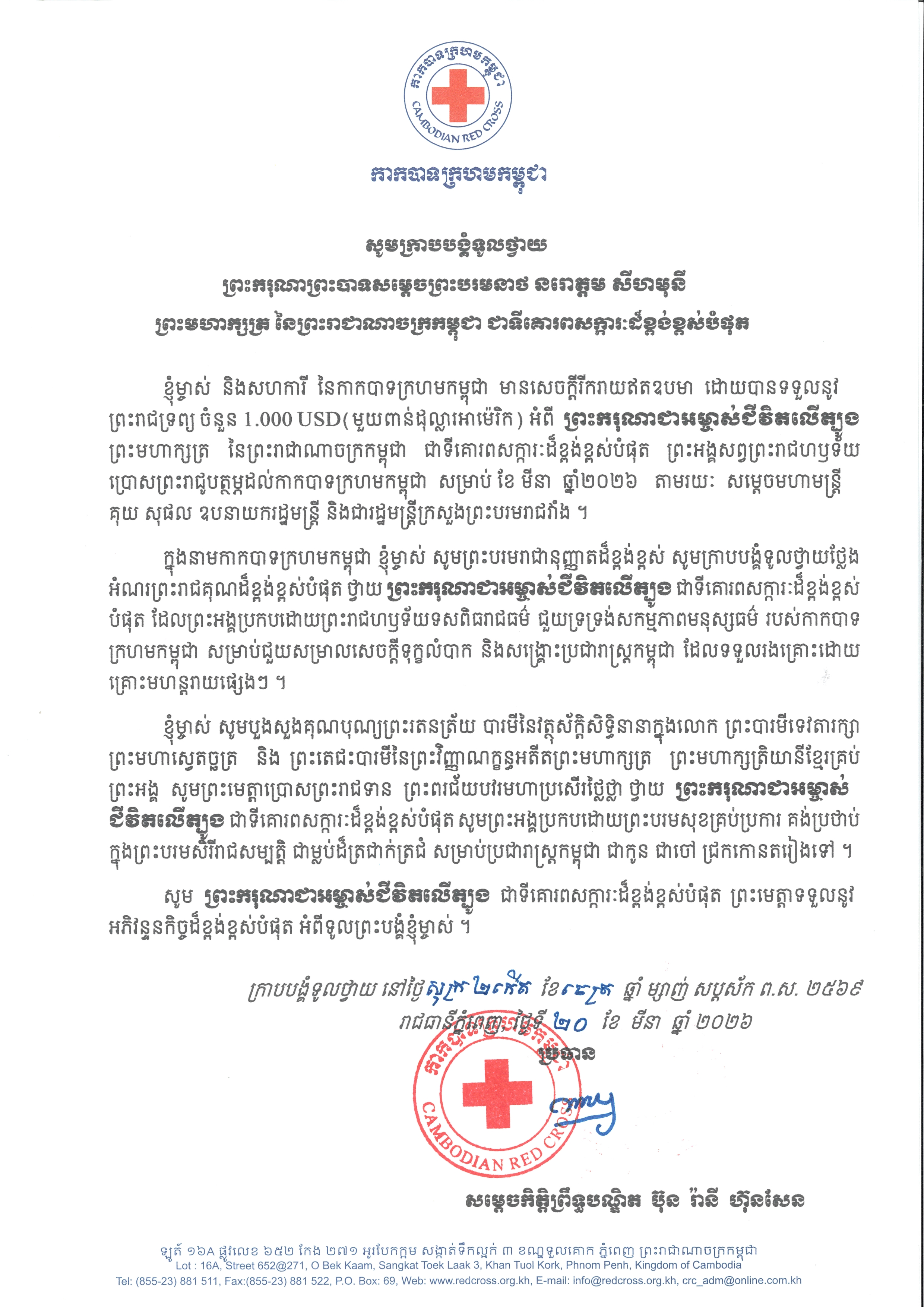 ក្នុងសារលិខិតនោះមានខ្លឹមសារថា ៖ «ខ្ញុំម្ចាស់ និងសហការី នៃកាកបាទក្រហមកម្ពុជា មានសេចក្តីរីករាយឥតឧបមា ដោយបានទទួលនូវព្រះរាជទ្រព្យ ចំនួន 1,000 USD (មួយពាន់ដុល្លារអាម៉េរិក) អំពី ព្រះករុណាជាអម្ចាស់ជីវិតលើត្បូង ព្រះមហាក្សត្រ នៃព្រះរាជាណាចក្រកម្ពុជា ជាទីគោរពសក្ការៈដ៏ខ្ពង់ខ្ពស់បំផុត ព្រះអង្គសព្វព្រះរាជហឫទ័យ ប្រោសព្រះរាជូបត្ថម្ភដល់កាកបាទក្រហមកម្ពុជា សម្រាប់ខែមីនា ឆ្នាំ២០២៦ តាមរយៈ សម្តេចមហាមន្ត្រី គុយ សុផល ឧបនាយករដ្ឋមន្ត្រី និងជារដ្ឋមន្ត្រីក្រសួងព្រះបរមរាជវាំង។