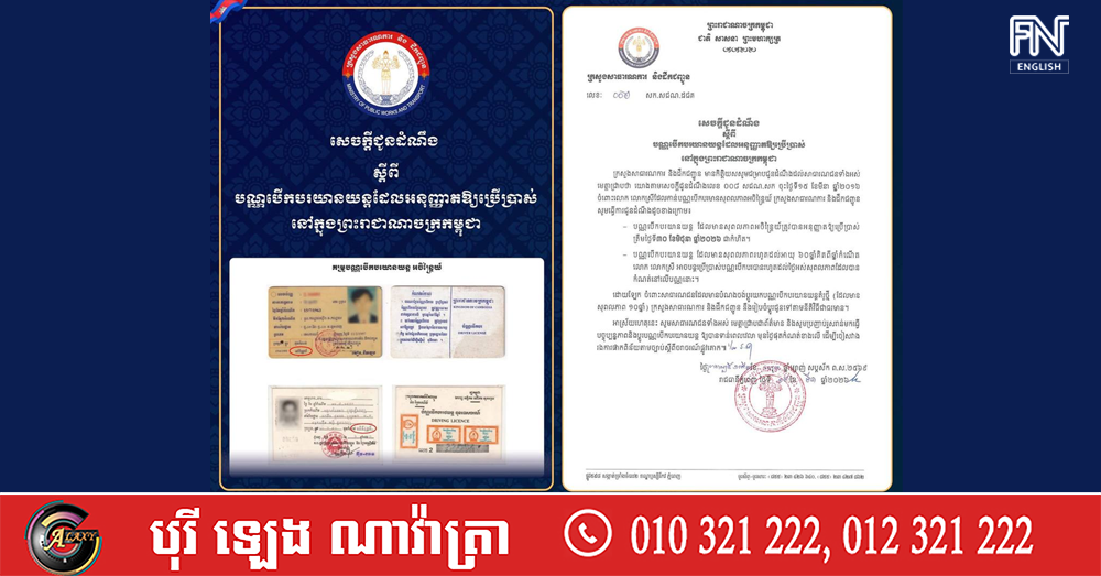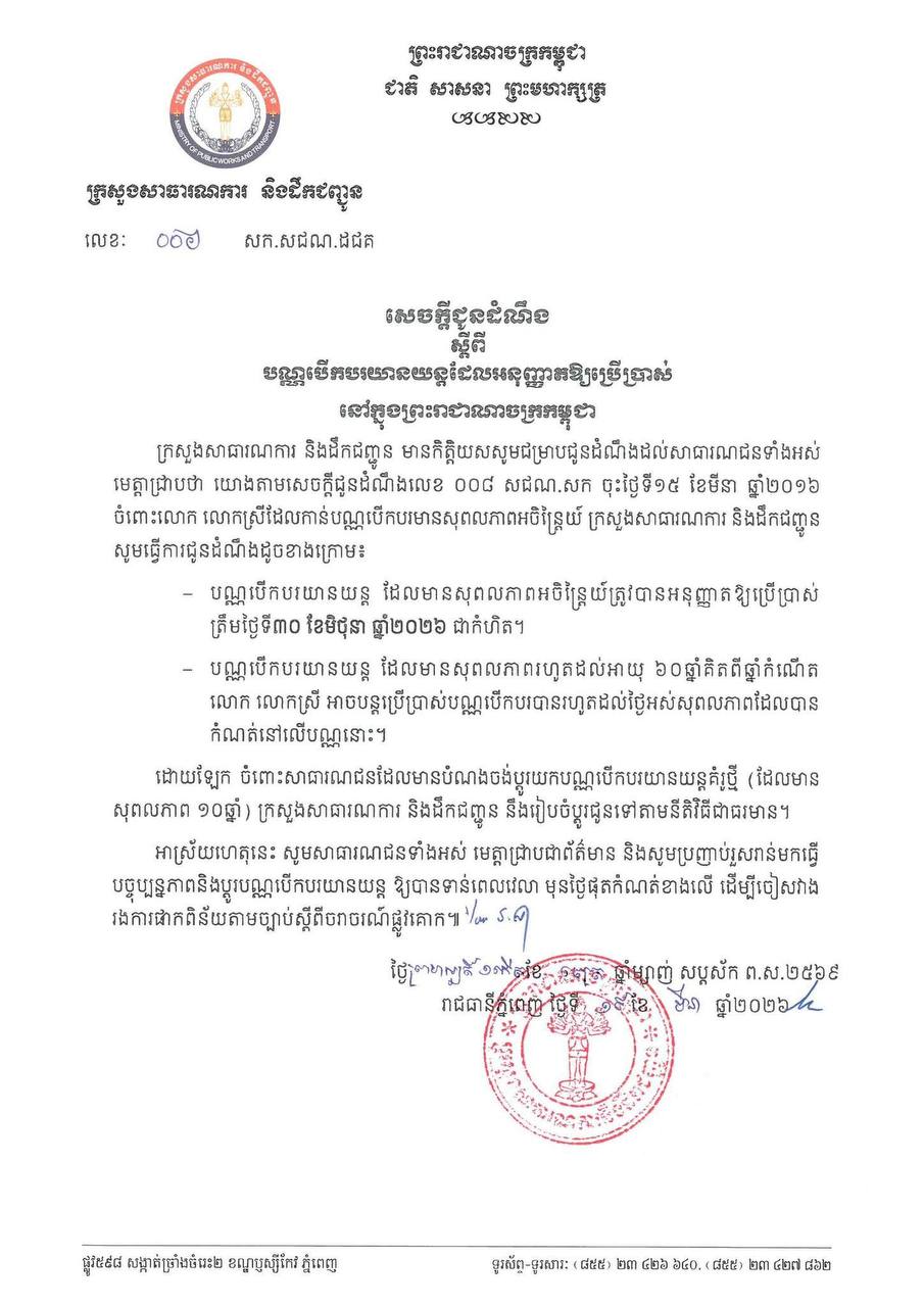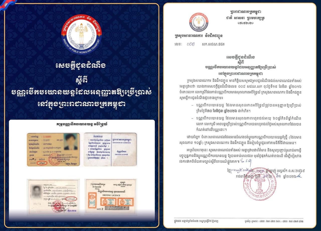 (ភ្នំពេញ)៖ ក្រសួងសាធារណការ និងដឹកជញ្ជូន ចេញសេចក្តីជូនដំណឹងស្តីពី បណ្ណបើកបរយានយន្តដែលអនុញ្ញាតឱ្យប្រើប្រាស់នៅកម្ពុជាបាន និងបានបញ្ជាក់ថា បណ្ណបើកបរយានយន្តដែលមានសុពលភាពអចិន្ត្រៃយ៍ ដែលធ្លាប់បានអនុញ្ញាតឱ្យប្រើនាពេលកន្លងមក ត្រូវបានអនុញ្ញាតឱ្យប្រើប្រាស់ត្រឹមថ្ងៃទី៣០ ខែមិថុនា ឆ្នាំ២០២៦ ជាកំហិត និងស្នើឱ្យសាធារណជនប្តូរយកបណ្ណបើកបរយានយន្តគំរូថ្មីដែលមានសុពលភាព ១០ឆ្នាំ។