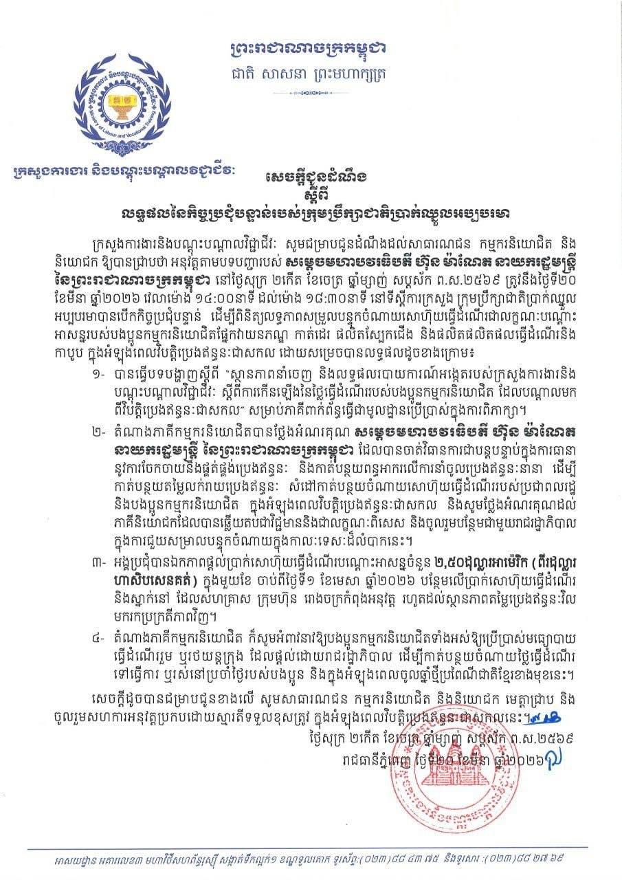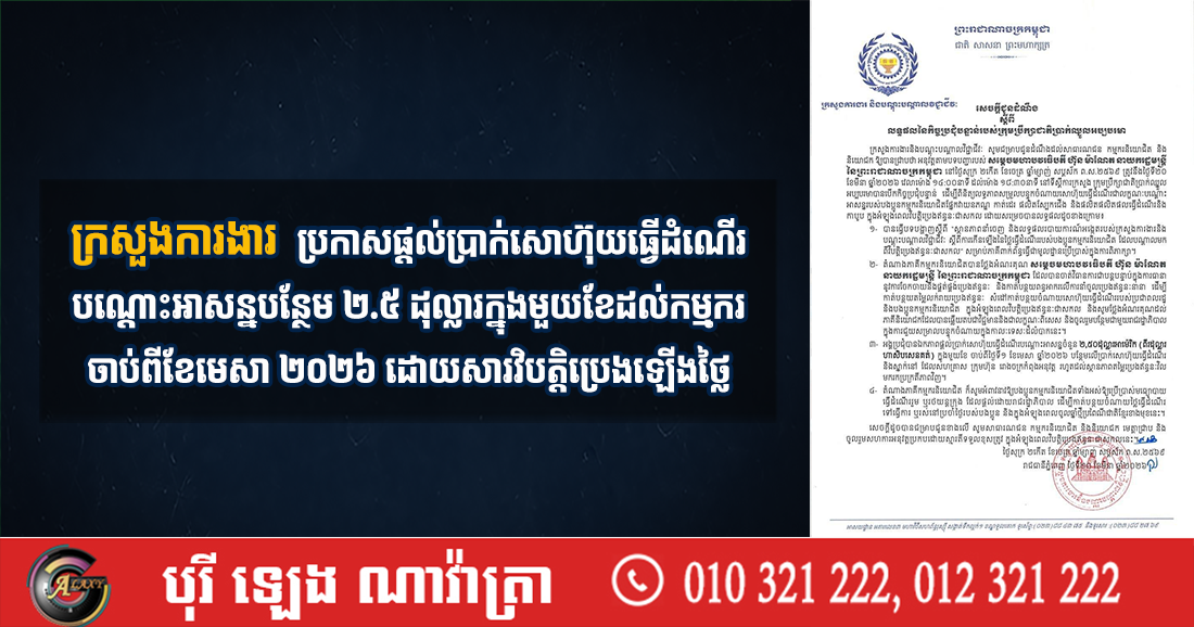 ក្រសួងការងារ ប្រកាសផ្តល់ប្រាក់សោហ៊ុយធ្វើដំណើរបណ្តោះអាសន្នបន្ថែម ២.៥ ដុល្លារ ក្នុងមួយខែ ចាប់ពីខែមេសា ២០២៦ ដោយសារវិបត្តិប្រេងឡើងថ្លៃ