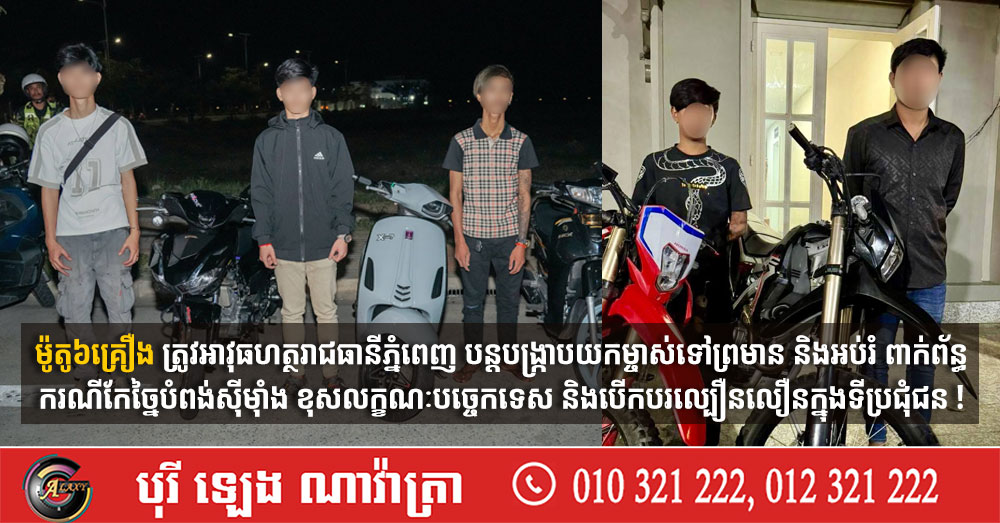(ភ្នំពេញ)៖ នៅយប់ថ្ងៃទី២២ ឈានចូលថ្ងៃទី២៣ ខែមីនា ឆ្នាំ២០២៦ កម្លាំងជំនាញអាវុធហត្ថរាជធានីភ្នំពេញ សហការជាមួយកម្លាំងមូលដ្ឋានអាវុធហត្ថខណ្ឌដូនពេញ និងខណ្ឌច្បារអំពៅ បានបន្តធ្វើការឃាត់ម្ចាស់ រួមនិងម៉ូតូ៦គ្រឿង ដែលបានកែច្នៃបំពង់ស៊ីម៊ាំងខុសលក្ខណៈបច្ចេកទេស បើកបរល្បឿនលឿន ក្នុងទីប្រជុំជនល្មើសច្បាប់កំណត់ បង្កឲ្យមានការភ័យខ្លាច និងមានសម្លេងរំខានដល់ប្រជាពលរដ្ឋ បាត់បង់សណ្ដាប់ធ្នាប់សាធារណៈលើដងផ្លូវ នៅចំណុចផ្លូវលេខ៧ សង្កាត់ចតុមុខ ខណ្ឌដូនពេញ និងតំបន់អភិវឌ្ឍកោះនរា ស្ថិតនៅភូមិកោះនរា សង្កាត់និរោធ ខណ្ឌច្បារអំពៅ រាជធានីភ្នំពេញ។