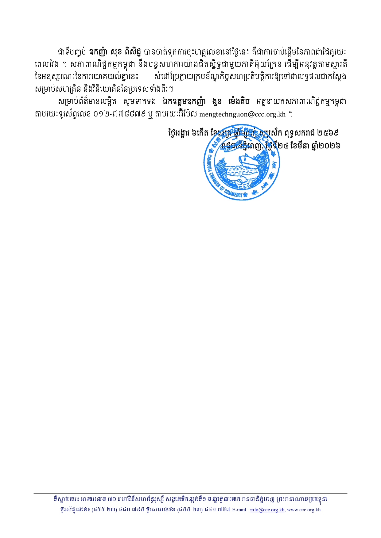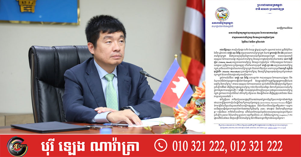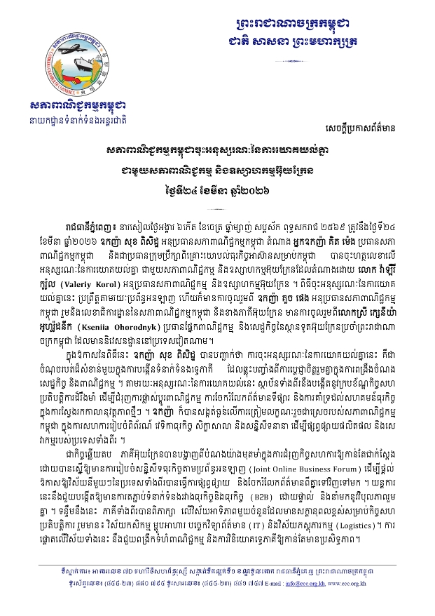 (ភ្នំពេញ)៖ នារសៀលថ្ងៃទី២៤ ខែមីនា ឆ្នាំ២០២៦ ឧកញ៉ា សុខ ពិសិដ្ឋ អនុប្រធានសភាពាណិជ្ជកម្មកម្ពុជា តំណាង អ្នកឧកញ៉ា គិត ម៉េង ប្រធានសភាពាណិជ្ជកម្មកម្ពុជា និងជាប្រធានក្រុមប្រឹក្សាពិគ្រោះយោបល់ធុរកិច្ចអាស៊ានសម្រាប់កម្ពុជា បានចុះហត្ថលេខាលើអនុស្សរណៈនៃការយោគយល់គ្នា ជាមួយសភាពាណិជ្ជកម្ម និងឧស្សាហកម្មអ៊ុយក្រែន ដែលតំណាងដោយលោក វ៉ាឡឺរី កូរ៉ូល (Valeriy Korol) អនុប្រធានសភាពាណិជ្ជកម្ម និងឧស្សាហកម្មអ៊ុយក្រែន។
