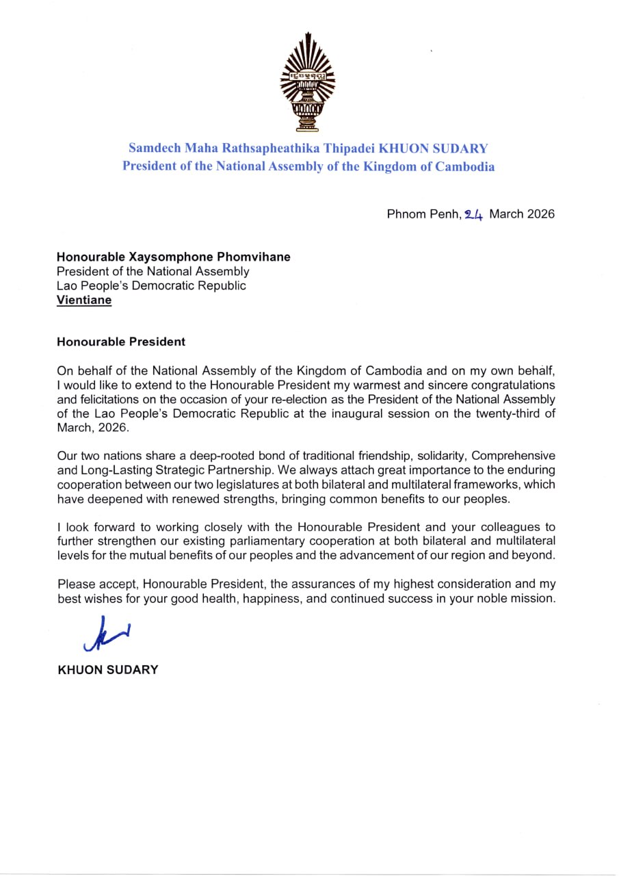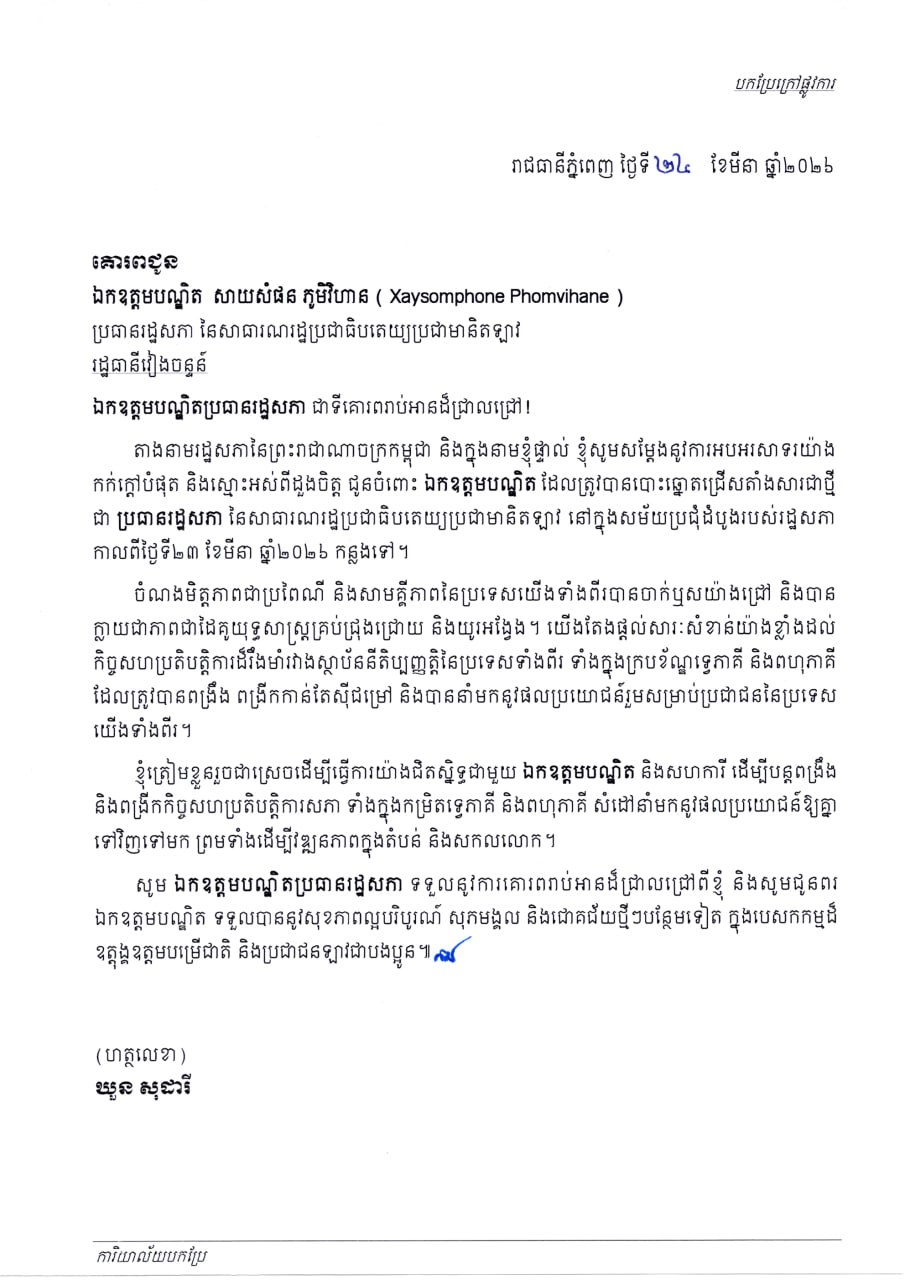 ក្នុងសារលិខិតអបអរសាទរ បានសរសេរថា «តាងនាមរដ្ឋសភានៃព្រះរាជាណាចក្រកម្ពុជា និងក្នុងនាមខ្ញុំផ្ទាល់ ខ្ញុំសូមសម្តែងនូវការអបអរសាទរយ៉ាងកក់ក្តៅបំផុត និងស្មោះអស់ពីដួងចិត្ត ជូនចំពោះ ឯកឧត្តមបណ្ឌិត ដែលត្រូវបានបោះឆ្នោតជ្រើសតាំងសារជាថ្មី ជាប្រធានរដ្ឋសភា នៃសាធារណរដ្ឋប្រជាធិបតេយ្យប្រជាមានិតឡាវ នៅក្នុងសម័យប្រជុំដំបូងរបស់រដ្ឋសភា កាលពីថ្ងៃទី២៣ ខែមីនា ឆ្នាំ២០២៦ កន្លងទៅ។