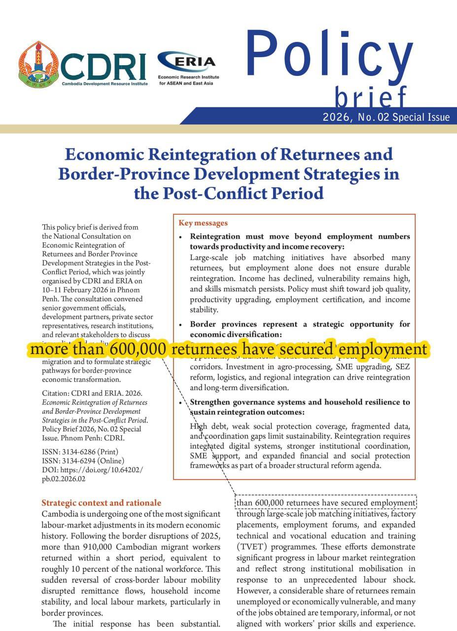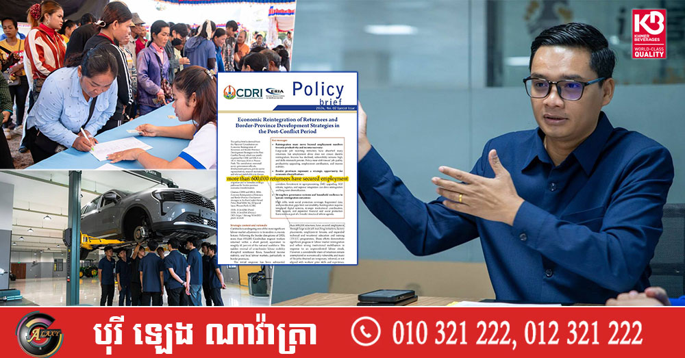 (ភ្នំពេញ)៖ វិទ្យាស្ថានបណ្ដុះបណ្ដាល និងស្រាវជ្រាវដើម្បីអភិវឌ្ឍន៍កម្ពុជា(CDRI) និងវិទ្យាស្ថានស្រាវជ្រាវសេដ្ឋកិច្ចអាស៊ាន និងអាស៊ីបូព៌ា(ERIA) បានផ្សាយរបាយការណ៍សិក្សាស្រាវជ្រាវរបស់ខ្លួនកាលពីខែកុម្ភៈ ឆ្នាំ២០២៦នេះថា ពលករខ្មែរដែលវិលត្រឡប់មកពីប្រទេសថៃប្រមាណជាង ៦០ម៉ឺននាក់ទទួលបានការងារធ្វើតាមរយៈការផ្គូផ្គងការងារទ្រង់ទ្រាយធំ ដែលមានវេទិកាការងារ ពិព័រណ៌ការងារចល័ត និងការពង្រីកកម្មវិធីអប់រំបណ្តុះបណ្តាលបច្ចេកទេស និងវិជ្ជាជីវៈ(TVET)។