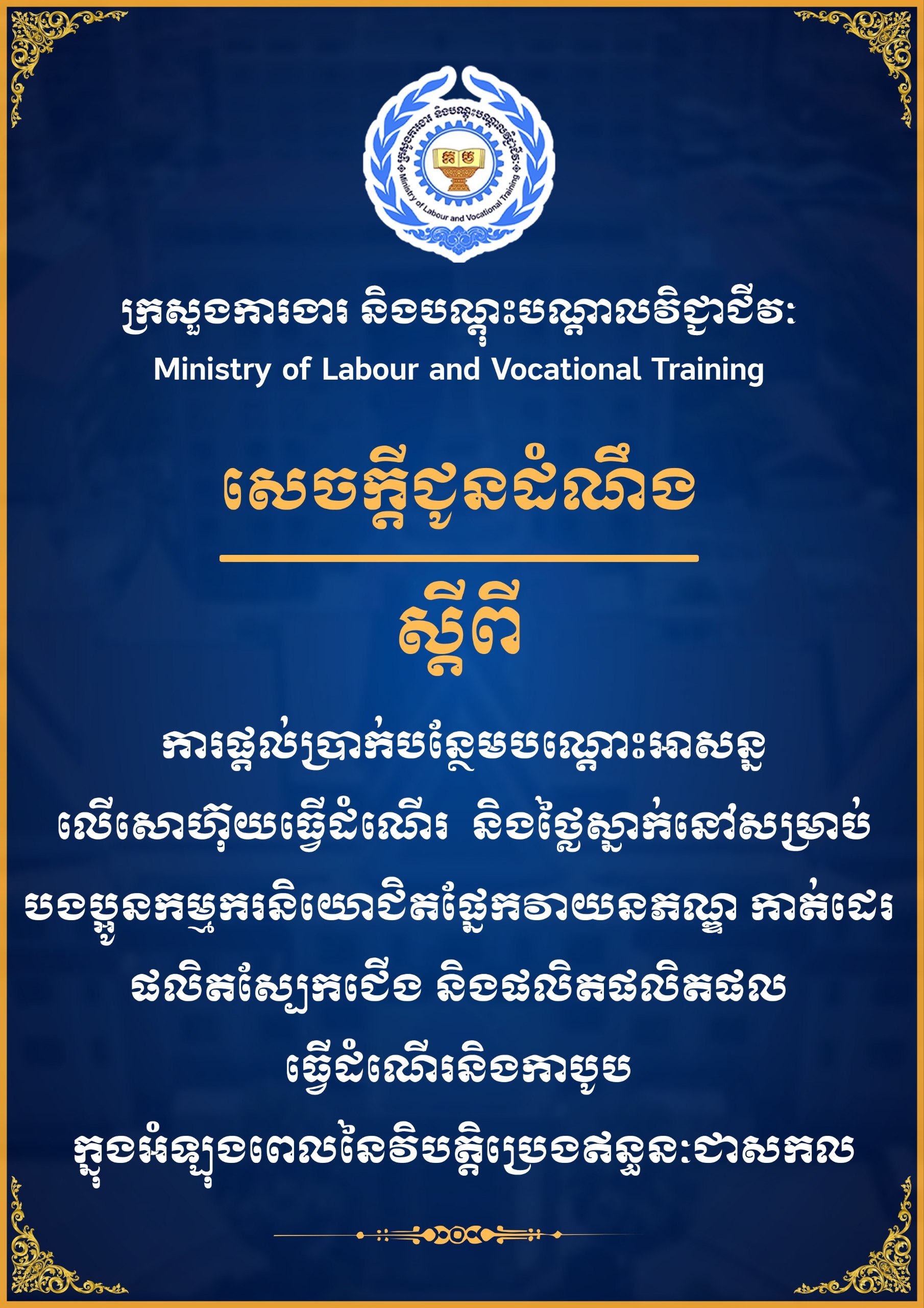 ខាងក្រោមនេះ ជាសេចក្តីជូនដំណឹងរបស់ ក្រសួងការងារ និងបណ្តុះបណ្តាលវិជ្ជាជីវៈ៖