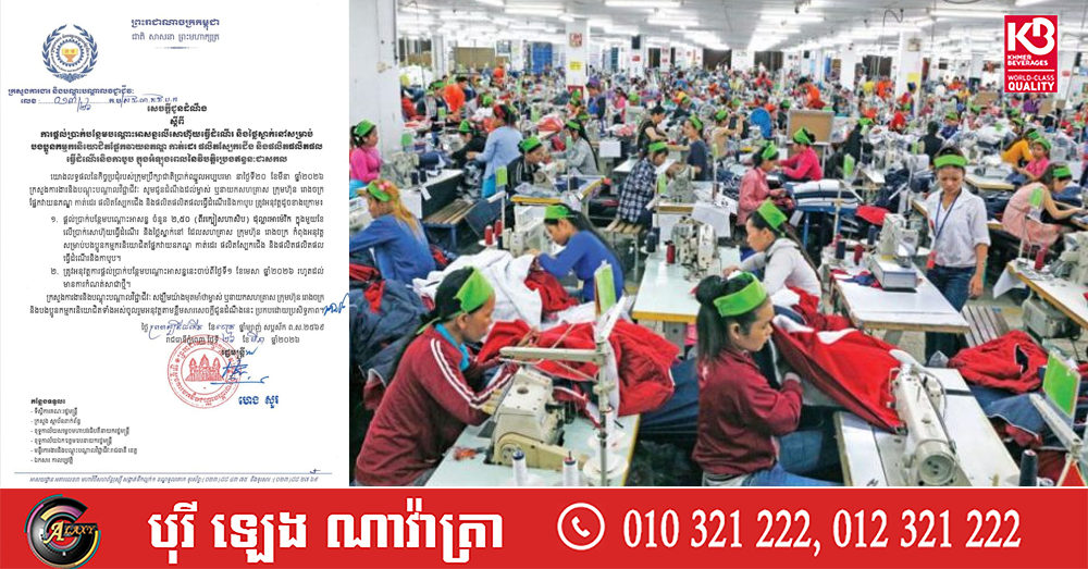 (ភ្នំពេញ)៖ ក្រសួងការងារនិងបណ្តុះបណ្តាលវិជ្ជាជីវៈ នៅថ្ងៃទី២៦ ខែមីនា ឆ្នាំ២០២៦នេះ បានចេញសេចក្តីជូនដំណឹងស្តីពី ការផ្តល់ប្រាក់បន្ថែមបណ្តោះអាសន្នលើសោហ៊ុយធ្វើដំណើរ និងថ្លៃស្នាក់នៅសម្រាប់ បងប្អូនកម្មករនិយោជិតផ្នែកវាយនភណ្ឌ កាត់ដេរ ផលិតស្បែកជើង និងផលិតផលិតផល ធ្វើដំណើរនិងកាបូប ក្នុងអំឡុងពេលនៃវិបត្តិប្រេងឥន្ធនៈជាសកល។ នេះបើយោងតាមសេចក្ដីជូនដំណឹងរបស់ ក្រសួងការងារ ដែលអង្គភាពព័ត៌មាន Fresh News ទទួលបាន៕