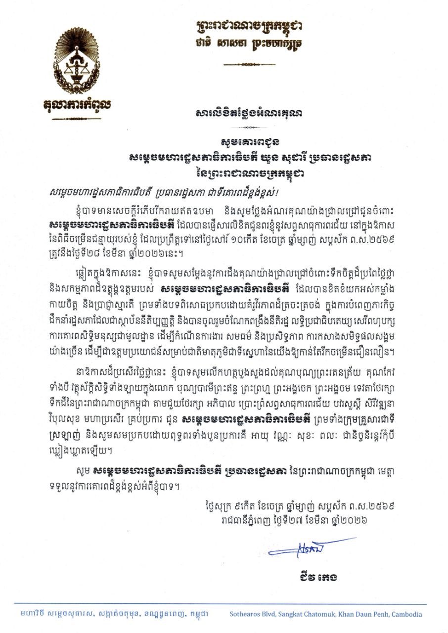 ក្នុងលិខិតថ្លែងអំណរគុណ បានសរសេរថា «ខ្ញុំបាទ និងភរិយាមានសេចក្តីរំភើបរីករាយឥតឧបមា និងសូមថ្លែងអំណរគុណយ៉ាងជ្រាលជ្រៅ ជូនចំពោះ សម្តេចមហារដ្ឋសភាធិការធិបតី ឃួន សុដារី ប្រធានរដ្ឋសភានៃកម្ពុជា ដែលបានផ្ញើសារលិខិតជូនពរខ្ញុំបាទ នូវសព្ទសាធុការពរជ័យ នៅក្នុងឱកាសនៃពិធីចម្រើនជន្មាយុរបស់ខ្ញុំបាទ ដែលប្រព្រឹត្តទៅនៅថ្ងៃសៅរ៍ ១០កើត ខែចេត្រ ឆ្នាំម្សាញ់ សប្តស័ក ព.ស.២៥៦៩ ត្រូវនឹងថ្ងៃទី២៨ ខែមីនា ឆ្នាំ២០២៦នេះ។