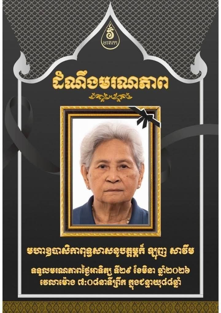(ភ្នំពេញ)៖ ឧបាសិកា ឡុញ សាវឹមបានទទួលមរណភាពកាលពីវេលាម៉ោង ៧:០៨នាទីព្រឹក ថ្ងៃអាទិត្យ១១កើត ខែចេត្រ ឆ្នាំម្សាញ់ សប្តស័ក ព.ស.២៥៦៩ ត្រូវនឹងថ្ងៃទី២៩ ខែមីនា ឆ្នាំ២០២៦ ក្នុងជន្មាយុ៨៨ឆ្នាំដោយជរាពាធ ។