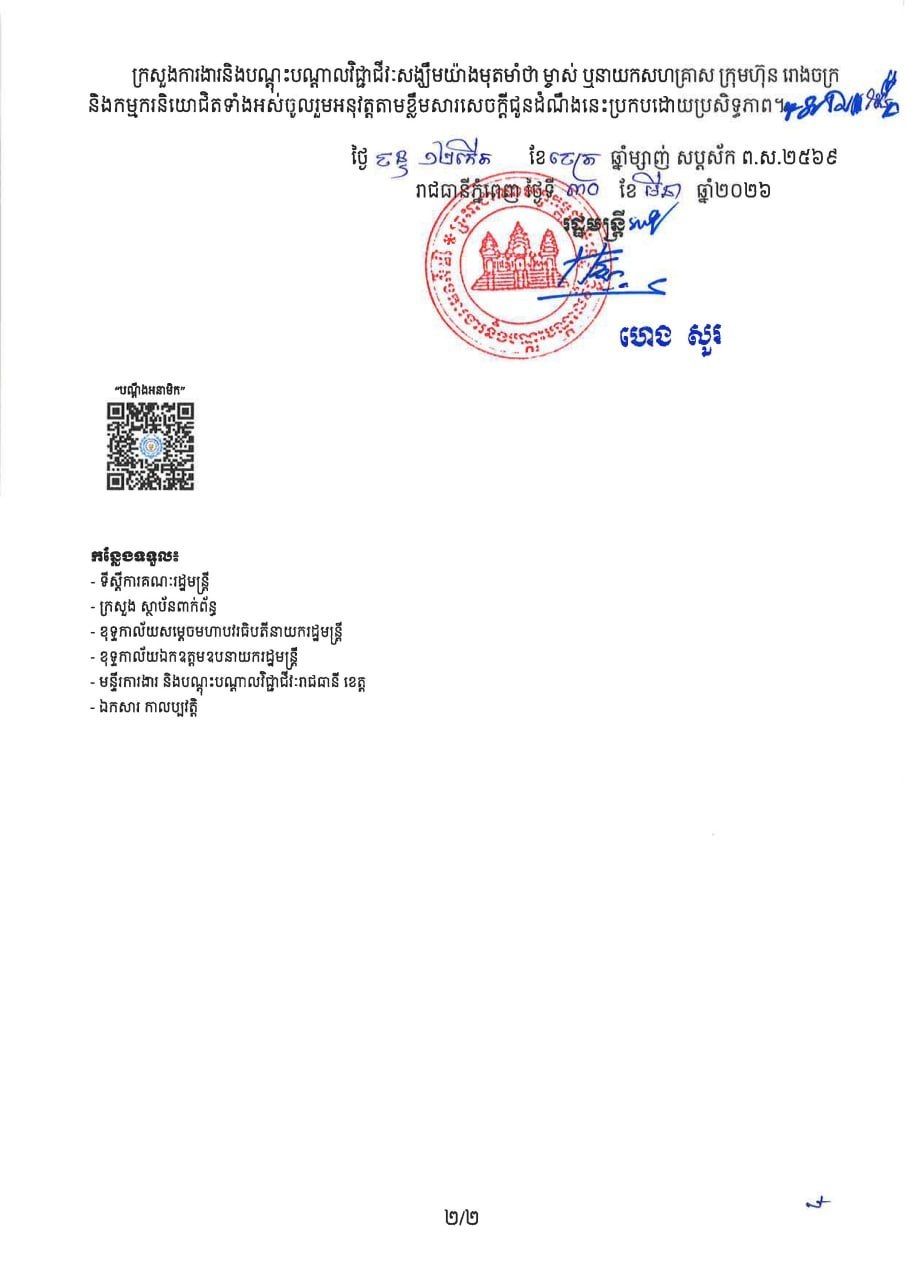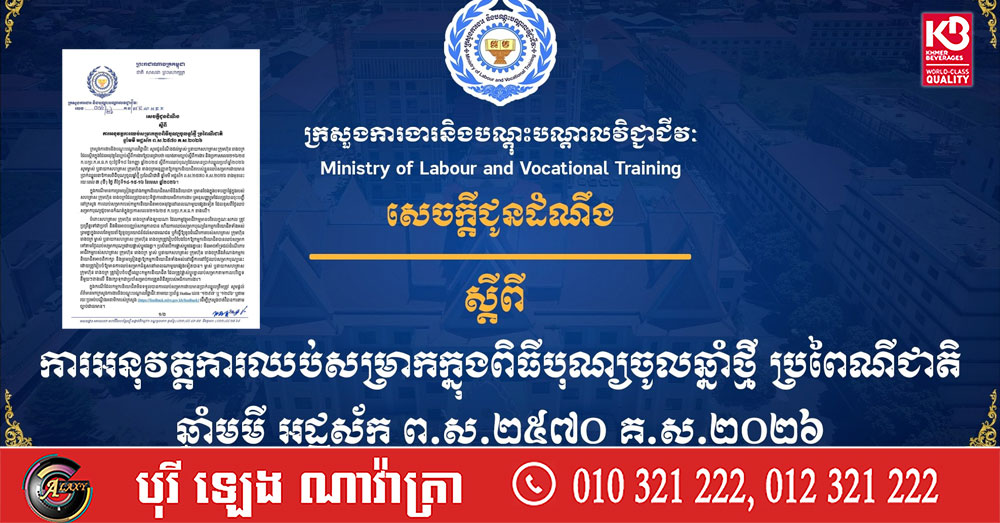 (ភ្នំពេញ)៖ ក្រសួងការងារ និងបណ្ដុះបណ្ដាលវិជ្ជាជីវៈ បានចេញសេចក្តីជូនដំណឹង ស្តីពីការអនុវត្តការឈប់សម្រាកក្នុងពិធីបុណ្យចូលឆ្នាំថ្មី ប្រពៃណីជាតិ ឆ្នាំមមី នៅថ្ងៃទី៣១ ខែមីនា ឆ្នាំ២០២៦នេះ បានចេញសេចក្តីជូនដំណឹងស្តីពីការអនុវត្តការឈប់សម្រាកក្នុងពិធីបុណ្យចូលឆ្នាំថ្មី ប្រពៃណីជាតិ ឆ្នាំមមី ដោយមានរយៈពេល៣ថ្ងៃ ចាប់ពីថ្ងៃទី១៤ ដល់ ថ្ងៃទី១៦ ខែមេសា ឆ្នាំ២០២៦ ដោយមានប្រាក់ឈ្នួល។