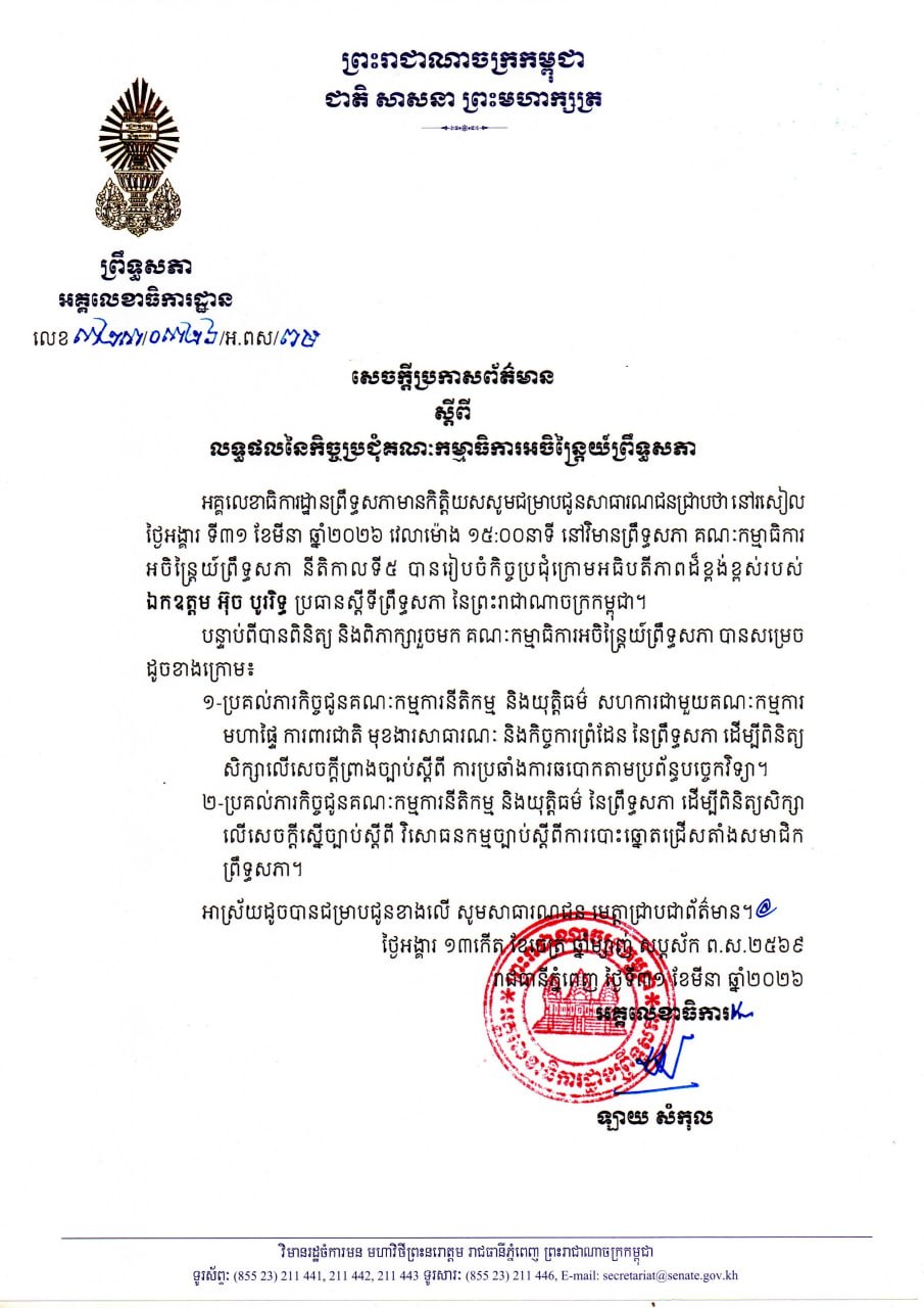 ព្រឹទ្ធសភា បង្ហាញលទ្ធផលនៃកិច្ចប្រជុំគណៈកម្មាធិការអចិន្រ្តៃព្រឹទ្ធសភា ដោយមានរបៀបវារៈចំនួន២